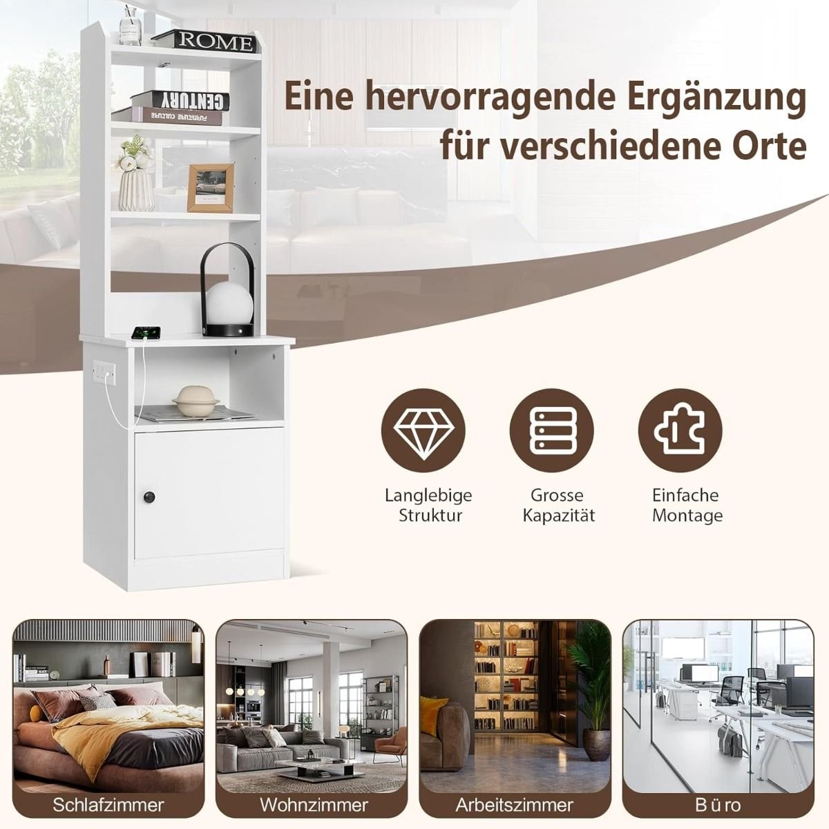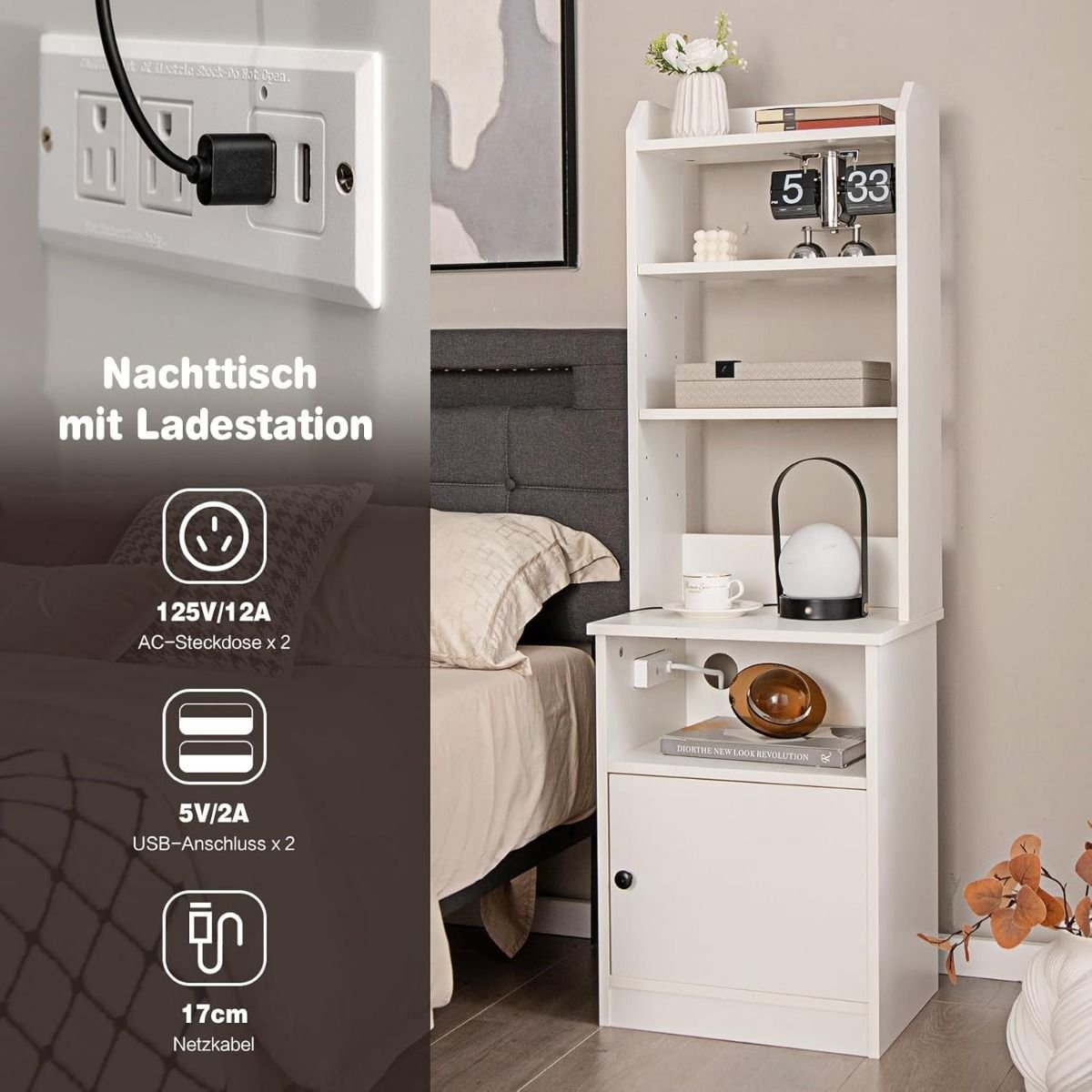 Aukštas spintelės tipo naktinis staliukas su integruota įkrovimo stotele (Balta)