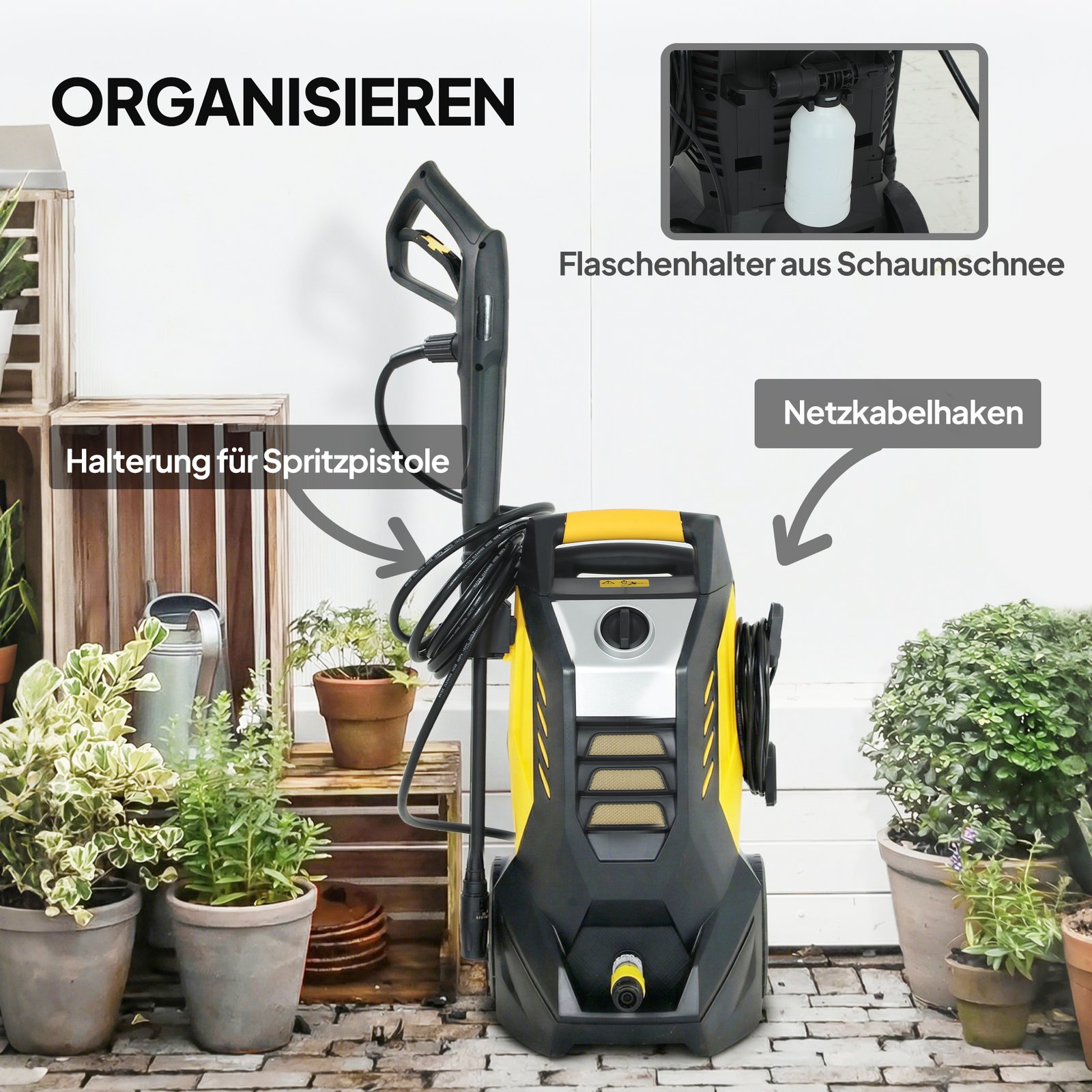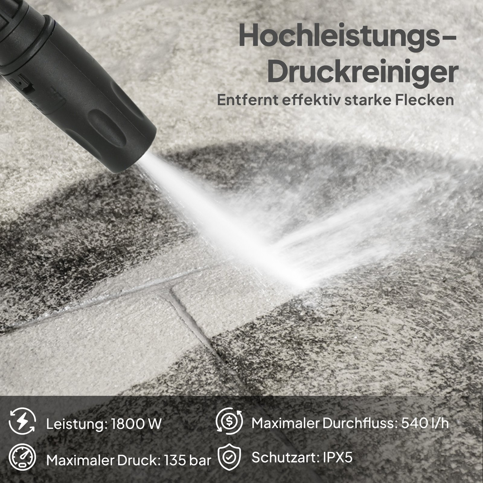 Lengvas įsisenėjusių dėmių valymas – su šiuo nešiojamuoju aukšto slėgio plautuvu. 1800 W variklis, kurio slėgis siekia 135 barus, yra galingas ir tiekia 540 litrų vandens per valandą. Purkštuko kampas reguliuojamas nuo 0 iki 40°, todėl galite lengvai nukreipti vandenį norima kryptimi. Su penkių metrų žarna, penkių metrų maitinimo laidu ir ratukais galite lengvai perkelti slėgio plautuvą ir pasiekti didelius atstumus.