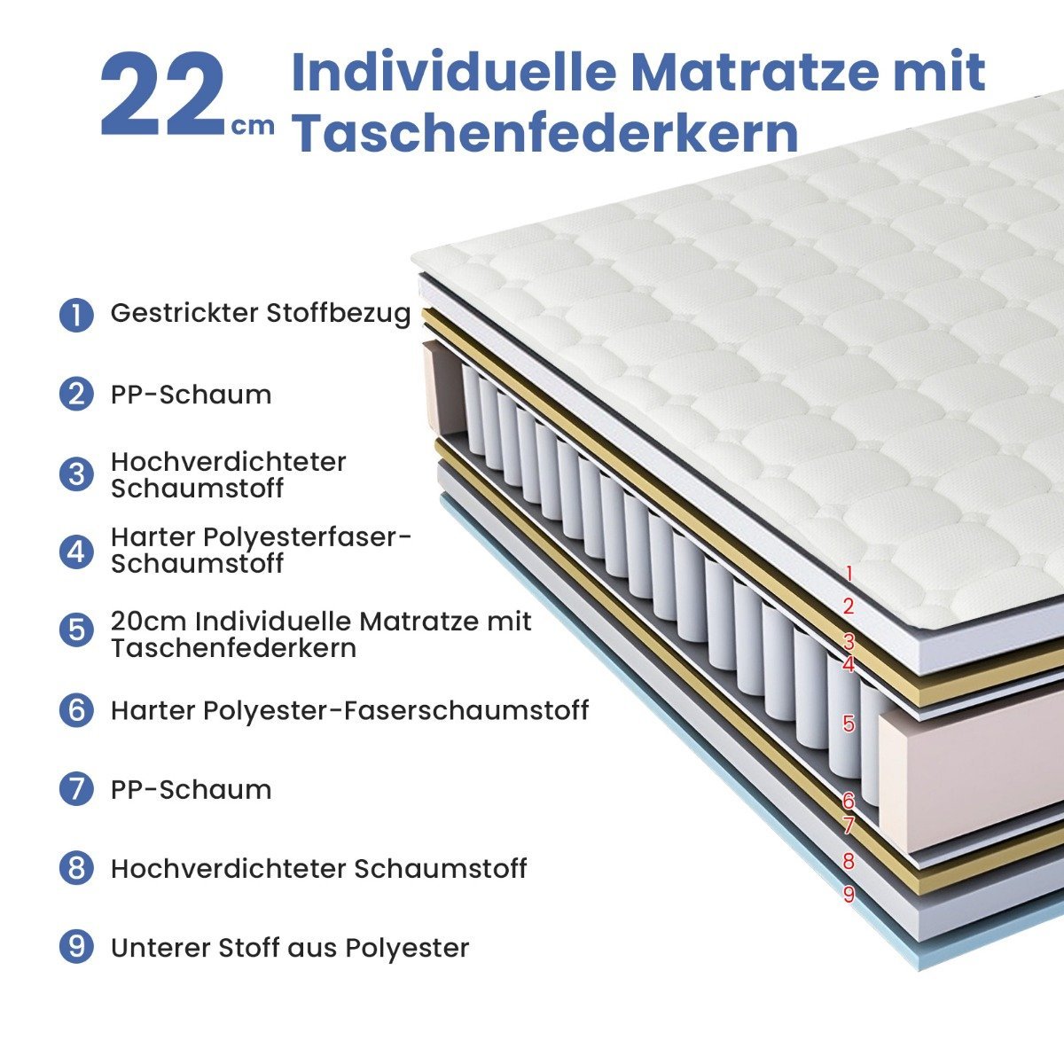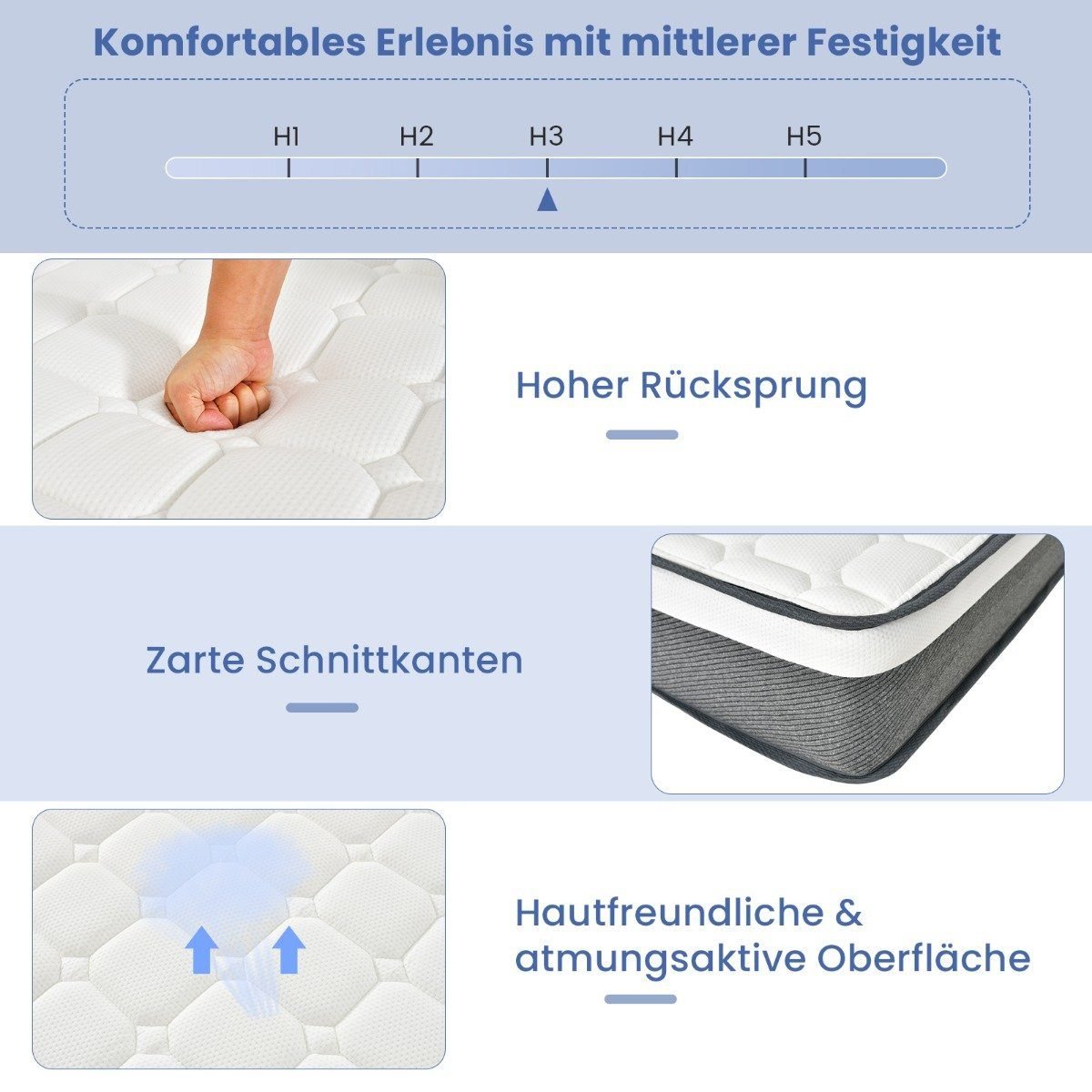 - Daugiasluoksnė konstrukcija, kurioje derinamos spyruoklės ir putų sluoksniai, užtikrinanti vidutinį kietumą (H3).