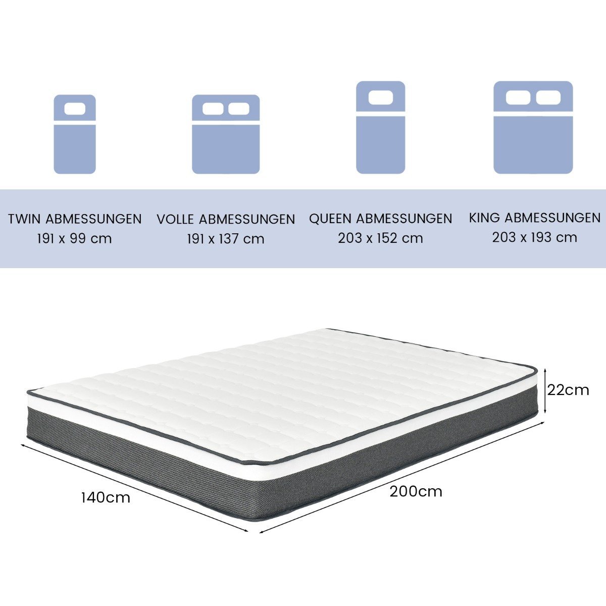 - Bendri matmenys: 200 cm x 140 cm x 22 cm (Ilgis x Plotis x Aukštis)