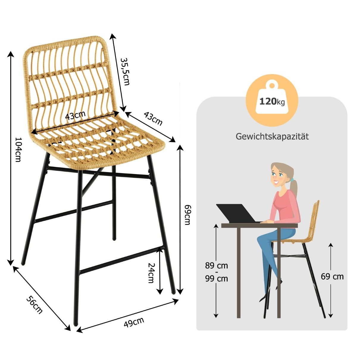 - Bendri kiekvieno taburetės matmenys: 56 x 49 x 104 cm (I x P x A)