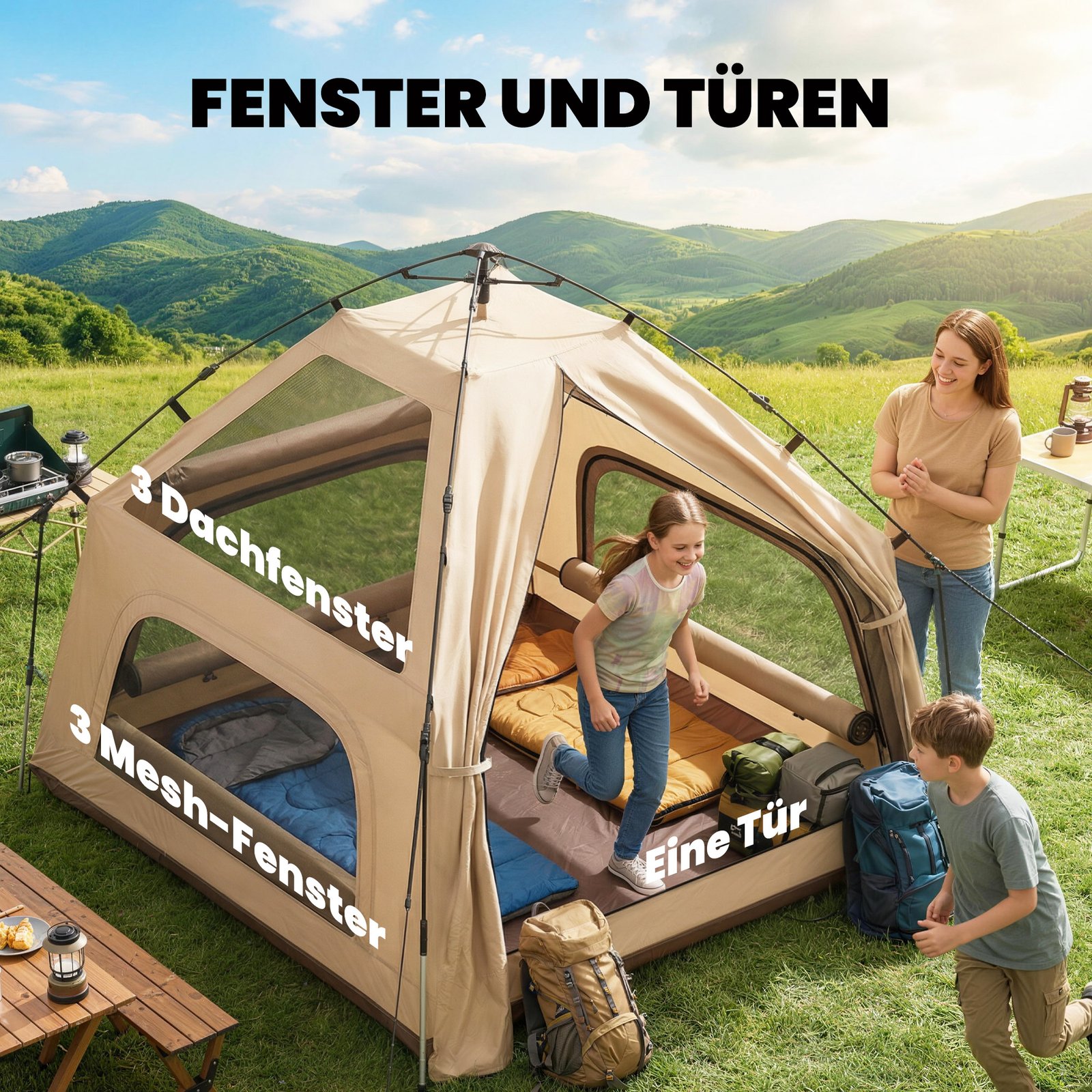 ✔ Erdvi vidinė erdvė su 184 cm stovimu aukščiu, idealiai tinka lauko nuotykiams mažose grupėse
