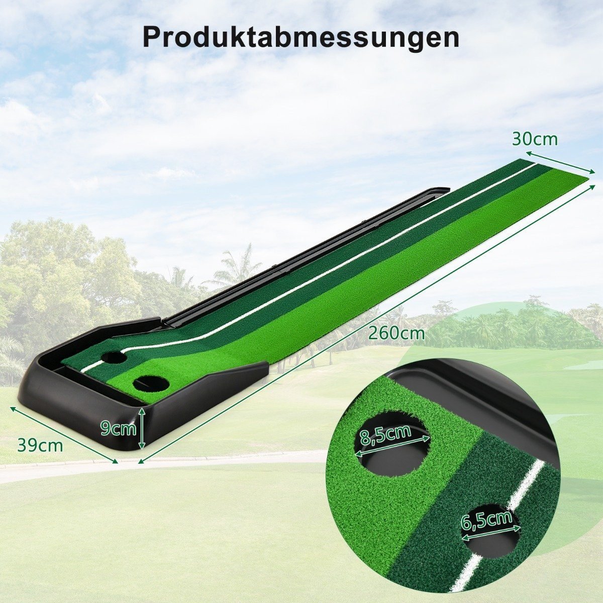 - Dvi skirtingos golfo skylių diametro parinktys (8,5 cm ir 6,5 cm) suteikia papildomo iššūkio ir padeda kelti tikslumą.