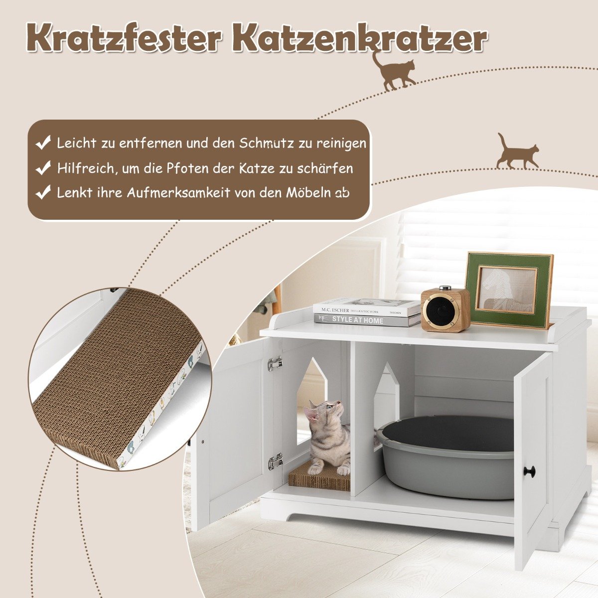 Suteikite savo katei privačią ir jaukią erdvę su šiuo elegantišku baldu, skirtu kačių tualetui. Jis puikiai paslėps nepageidaujamą išvaizdą ir apsaugos jūsų baldus nuo draskymų, taip sukuriant tvarkingesnę aplinką jūsų namuose.