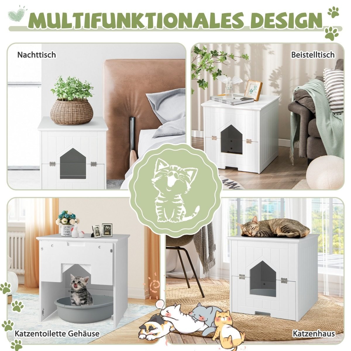- Gali būti naudojamas kaip naktinis staliukas, spintelė ar namelis katei.