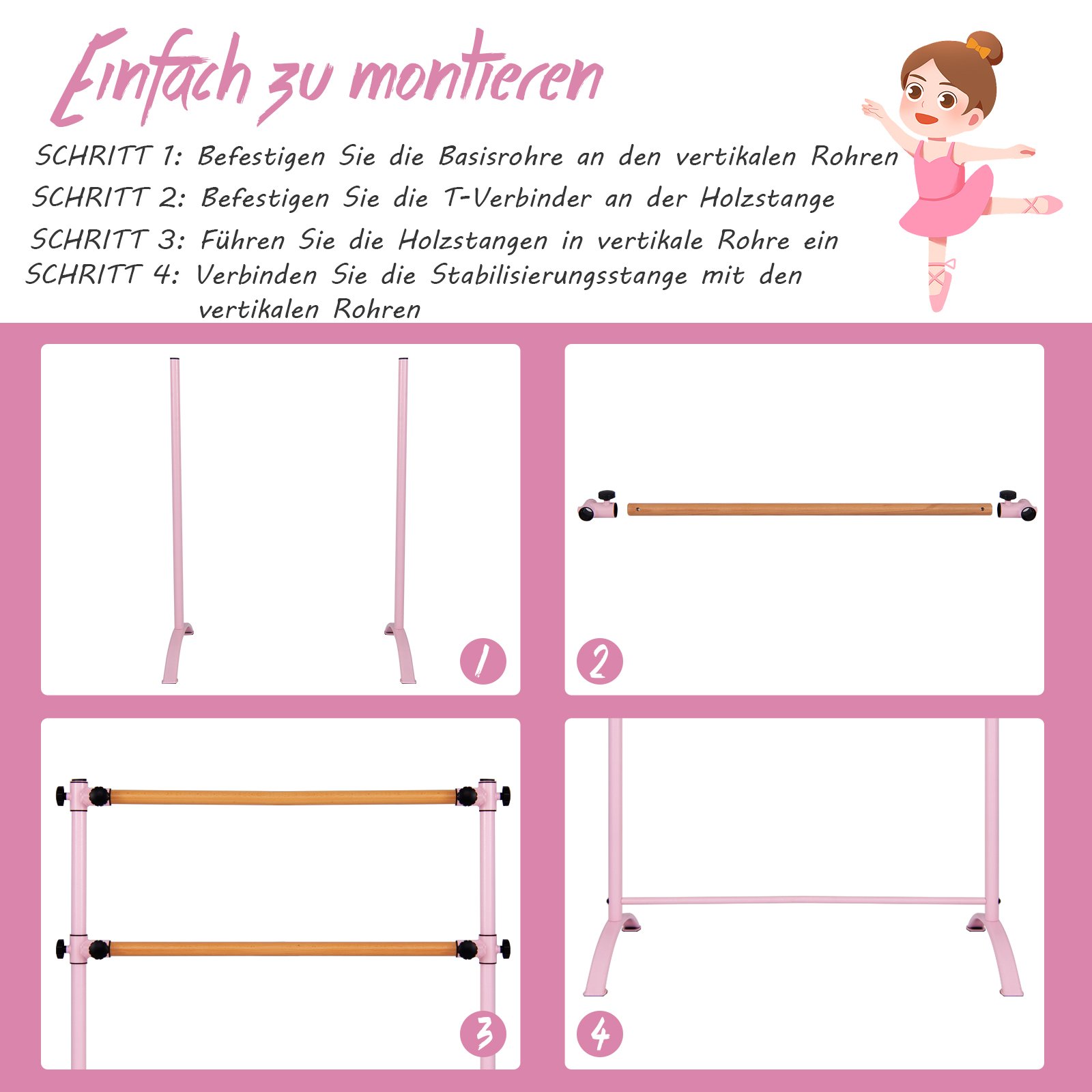 Ši laisvai stovinti dviguba baleto lazda yra puikus pagalbininkas tempimo pratimams, šokio treniruotėms ir bendram fiziniam aktyvumui. Su 4 reguliuojamais aukščiais (56/76/96/116 cm) ji puikiai tinka tiek vaikams, tiek suaugusiems. Lazdų gamybai naudojama natūrali buko mediena, o atraminis rėmas pagamintas iš tvirtų metalinių vamzdžių, užtikrinančių stabilumą ir ilgaamžiškumą. Platus pagrindas su neslystančiais padukais užtikrina patikimą stabilumą net ant lygių paviršių.