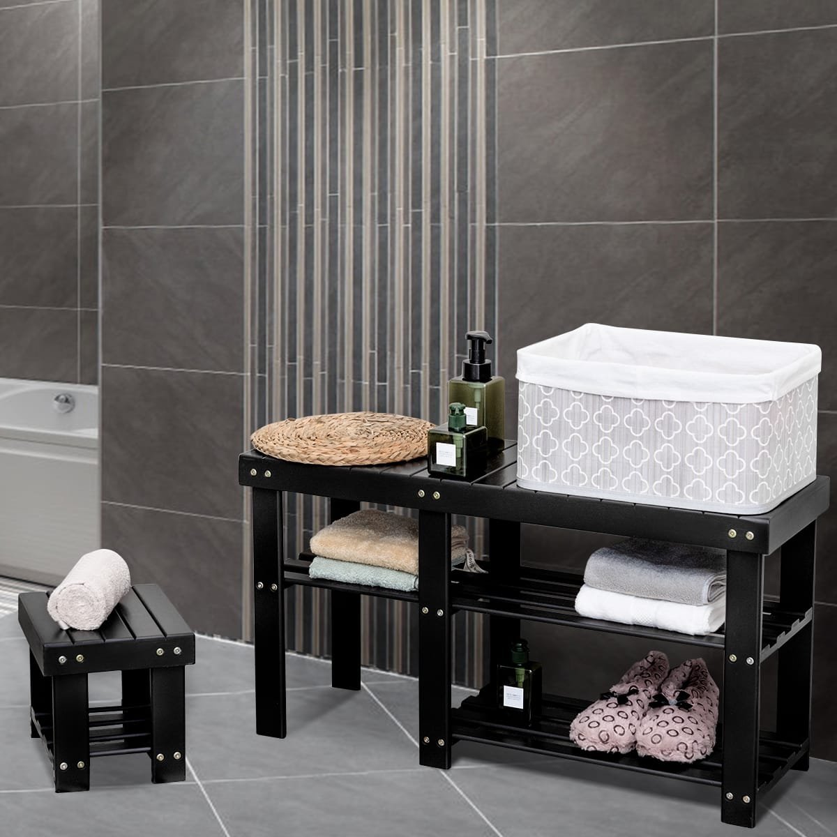 Bambukinė batų spintelė su sėdyne (Juoda)