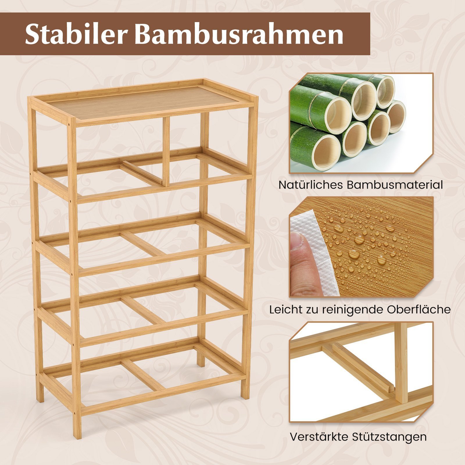 Optimizuokite savo erdvę su šia elegantiška bambusine komoda! Su penkiais įvairių dydžių stalčiais ir patogia viršutine lentyna, ji puikiai tiks rūbams, aksesuarams ir dekoracijoms laikyti. Pagaminta iš natūralaus bambuko, ši komoda ne tik užtikrina ilgaamžiškumą, bet ir suteikia jūsų namams natūralios elegancijos. Be to, pridedami apsaugos nuo apvirtimo elementai užtikrina stabilumą ir saugumą.
