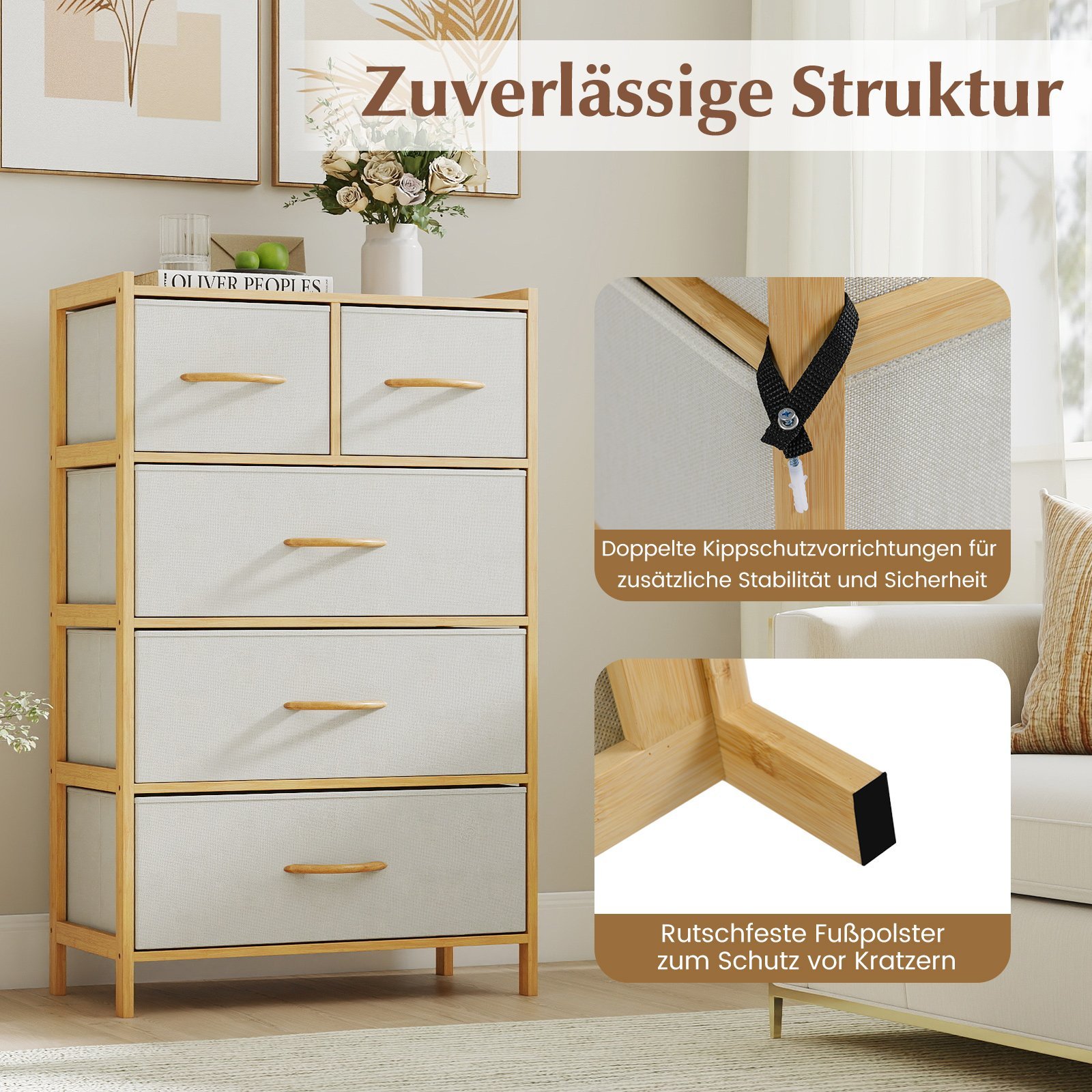 Bambukinė komoda su 5 medžiaginiais stalčiais ir viršutine lentyna (Natūrali)