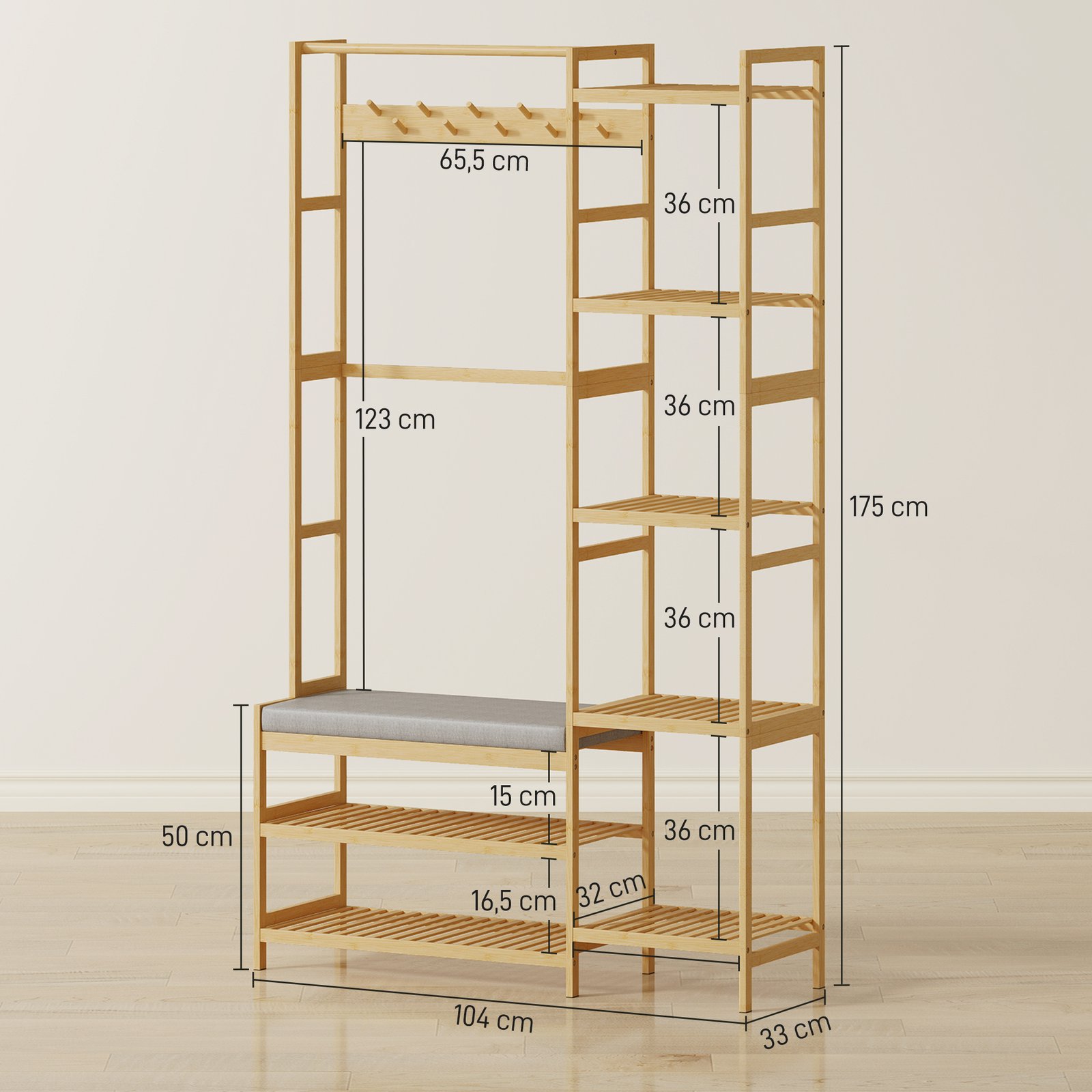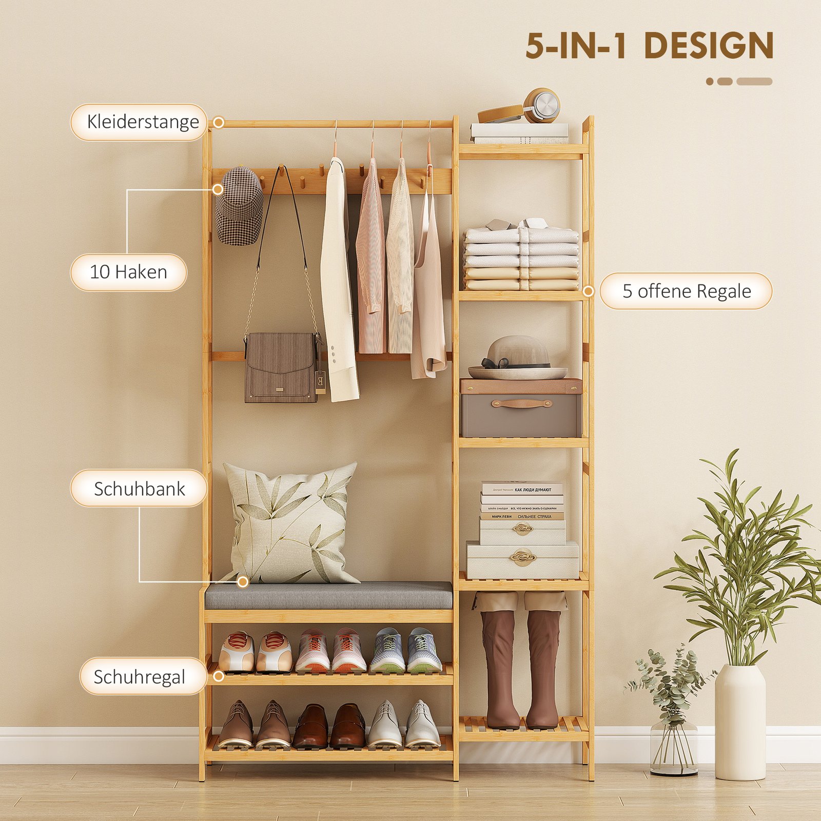 Kenčiate dėl netvarkingos prieangio erdvės, pilnos paltų, batų ir krepšių? Šis garderobas su 5-in-1 dizainu padės išspręsti šią problemą. Įrengtas elegantiškas bambuko drabužių stovas, dešimt kabliukų ir daug vietos daiktams, jis užtikrina tvarką. Patirkite tvarkingą, kviečiančią įeigos zoną, kuri palengvins jūsų šeimos kasdienybę ir atneš ramybę į jūsų namus.