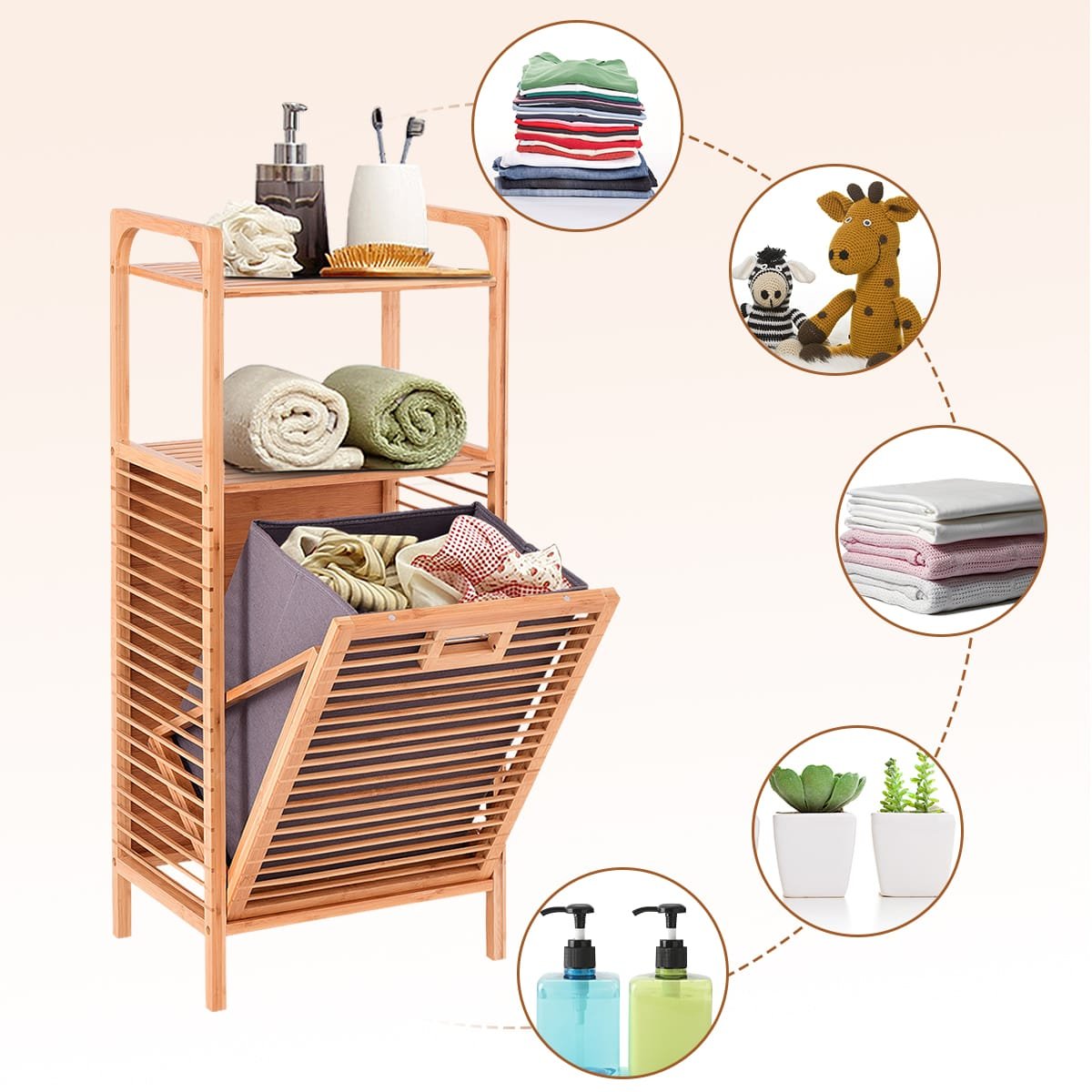 - Dviguba funkcija: talpus skalbinių maišas ir 2 atviros lentynos smulkiems daiktams laikyti.