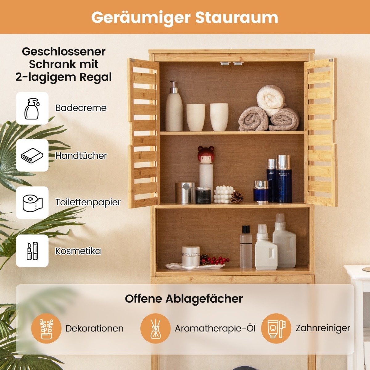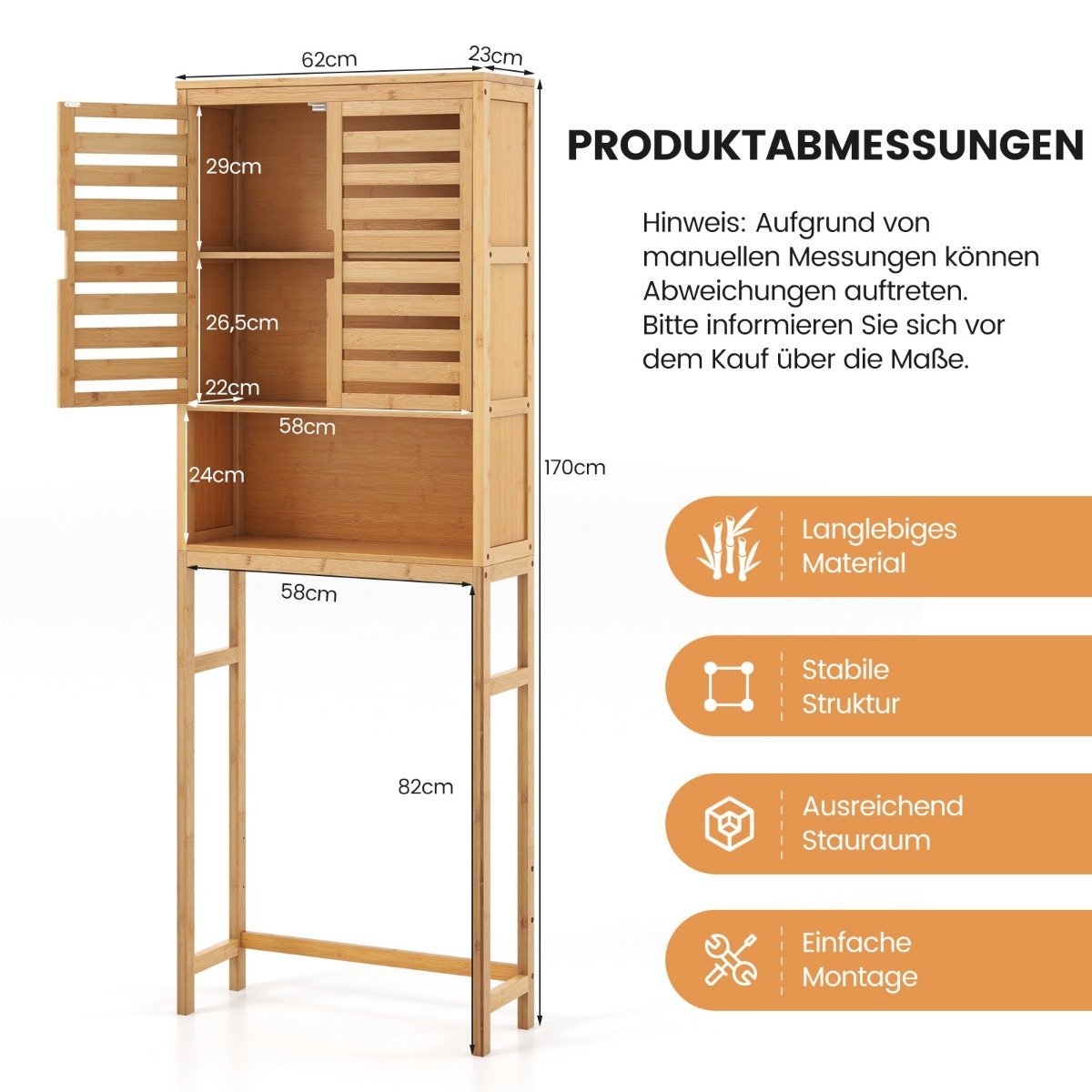 Bambukinė spintelė virš unitazo su durelėmis ir atviru lentynėliu (Natūrali)