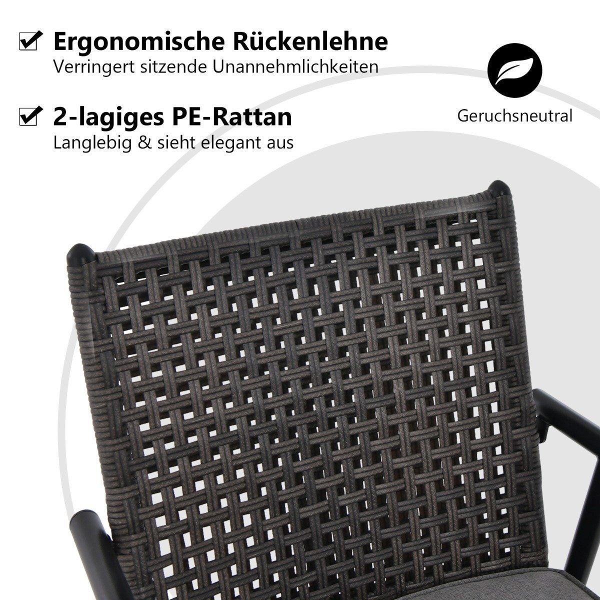 • Ergonomiški, 2 sluoksnių PE rotango atlošai užtikrina nugaros atramą.