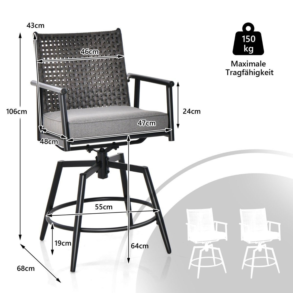 Patirkite komfortą ir eleganciją su šiuo rafinuotu dviejų baro kėdžių komplektu. Kėdžių sėdynės pagamintos iš aukštos kokybės, kvėpuojančio ir greitai džiūstančio audinio, todėl puikiai tinka naudoti lauke. 360° pasukamos sėdynės leidžia lengvai bendrauti į visas puses, o atlošai ir kojų atramos suteikia papildomo patogumo.