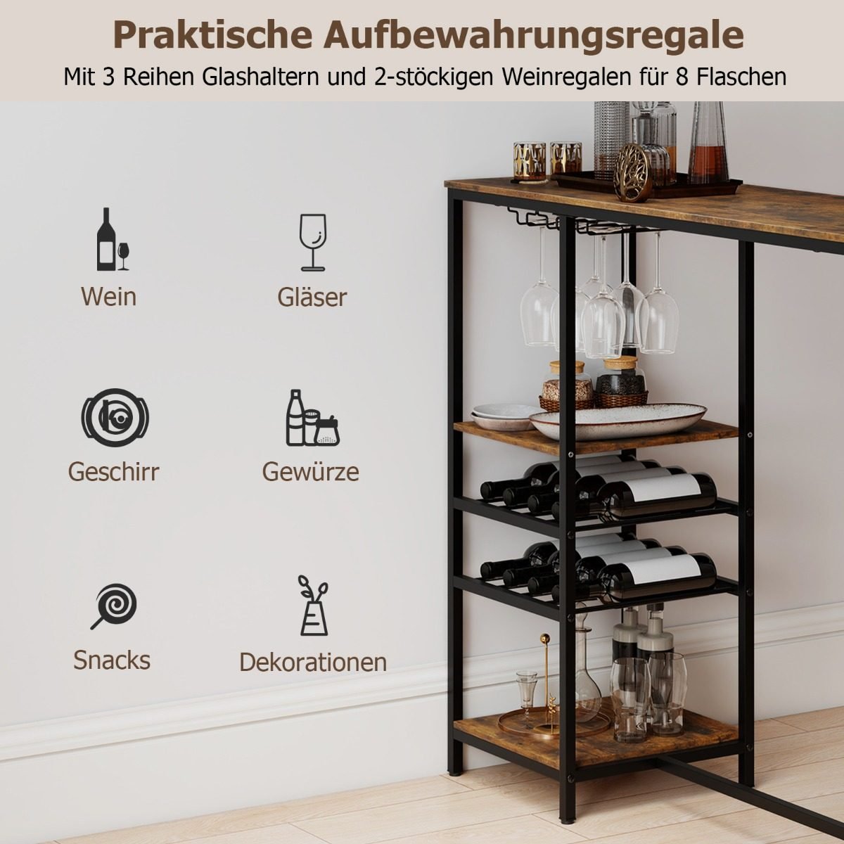 - Trys eilių laikikliai vyno taurėms ir dviejų lygių vyno laikiklis (8 buteliams).