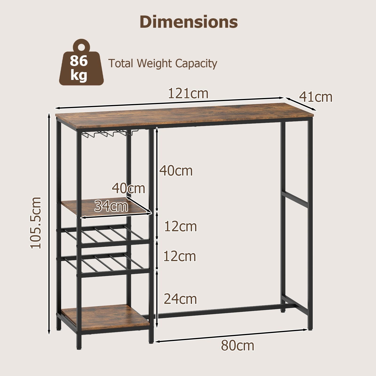 - Atstumas tarp vyno laikiklių eilių: 12 cm