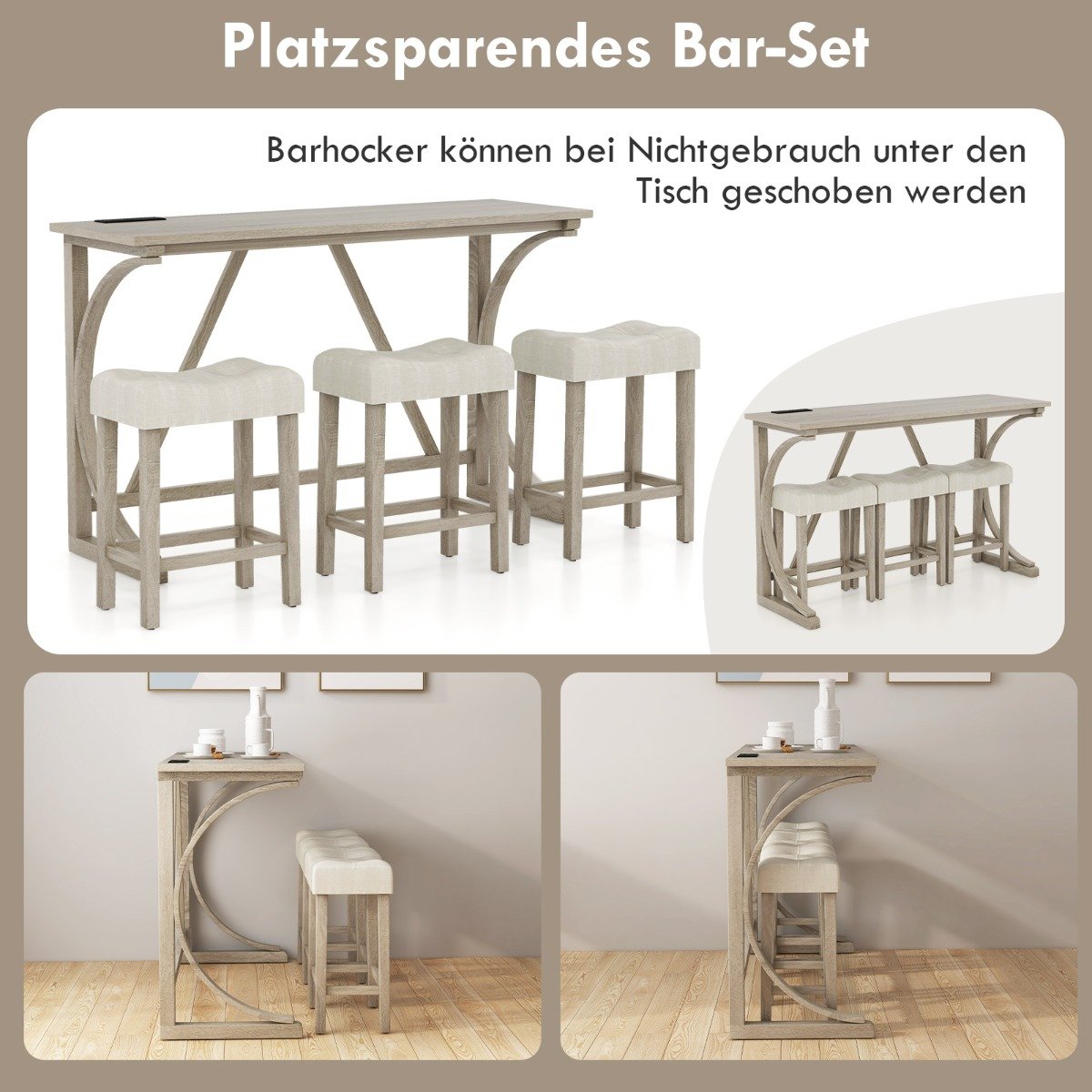 Baro stalas su trimis taburetėmis ir integruotais elektros lizdais (Smėlio)