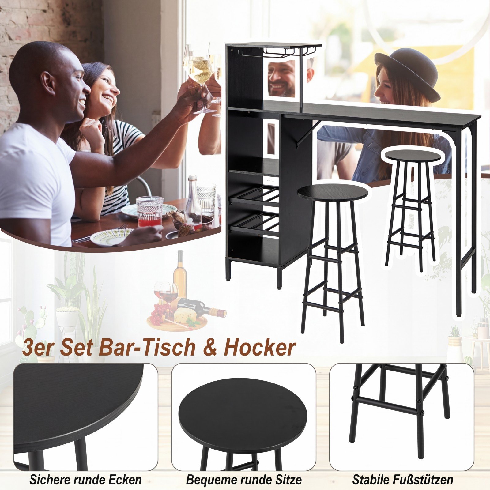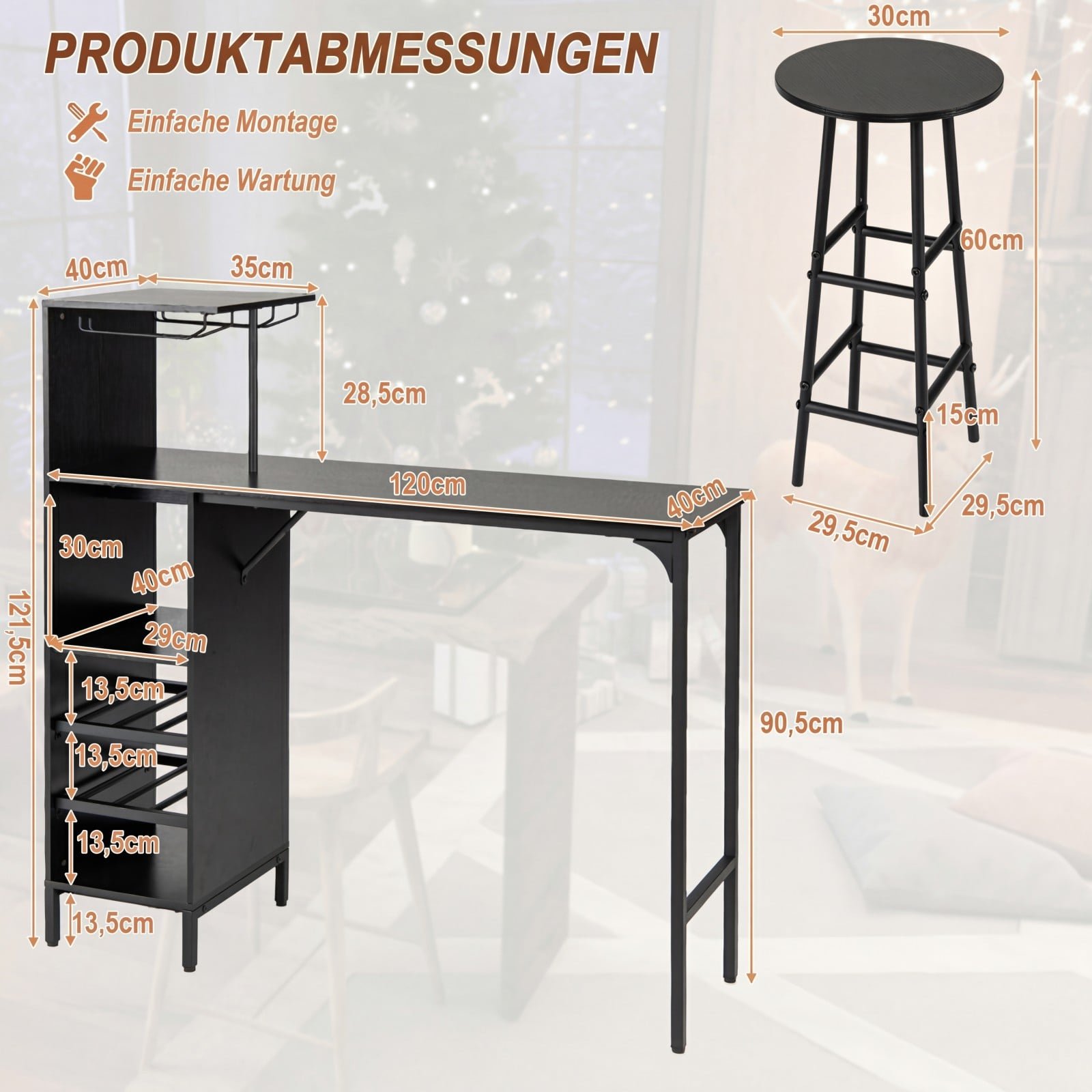 Šis stilingas baro stalo komplektas su kėdėmis ir daugiafunkcėmis šoninėmis lentynomis sukurs jaukią atmosferą jūsų namuose. Jis siūlo patogų ir tvarkingą vyno butelių, taurių, indų bei kitų baro reikmenų laikymą, puikiai tinkantį mažoms erdvėms. Kai nenaudojamos, abi kėdės gali būti elegantiškai pastumtos po stalu, maksimaliai taupant erdvę.