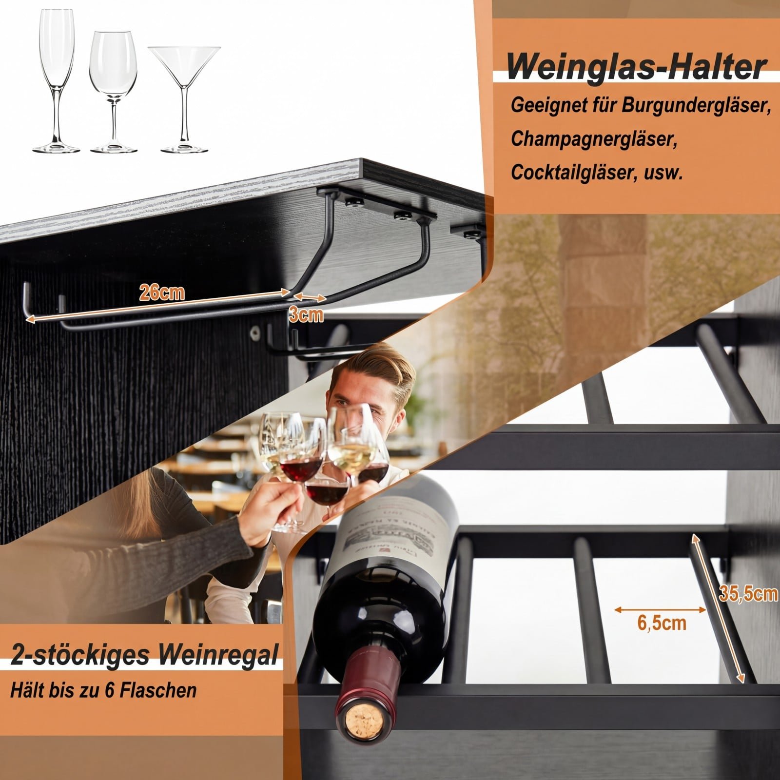 - Specialus vyno laikymas: Su specialiu taurių laikikliu ir lentyna, talpinančia iki 6 vyno butelių.