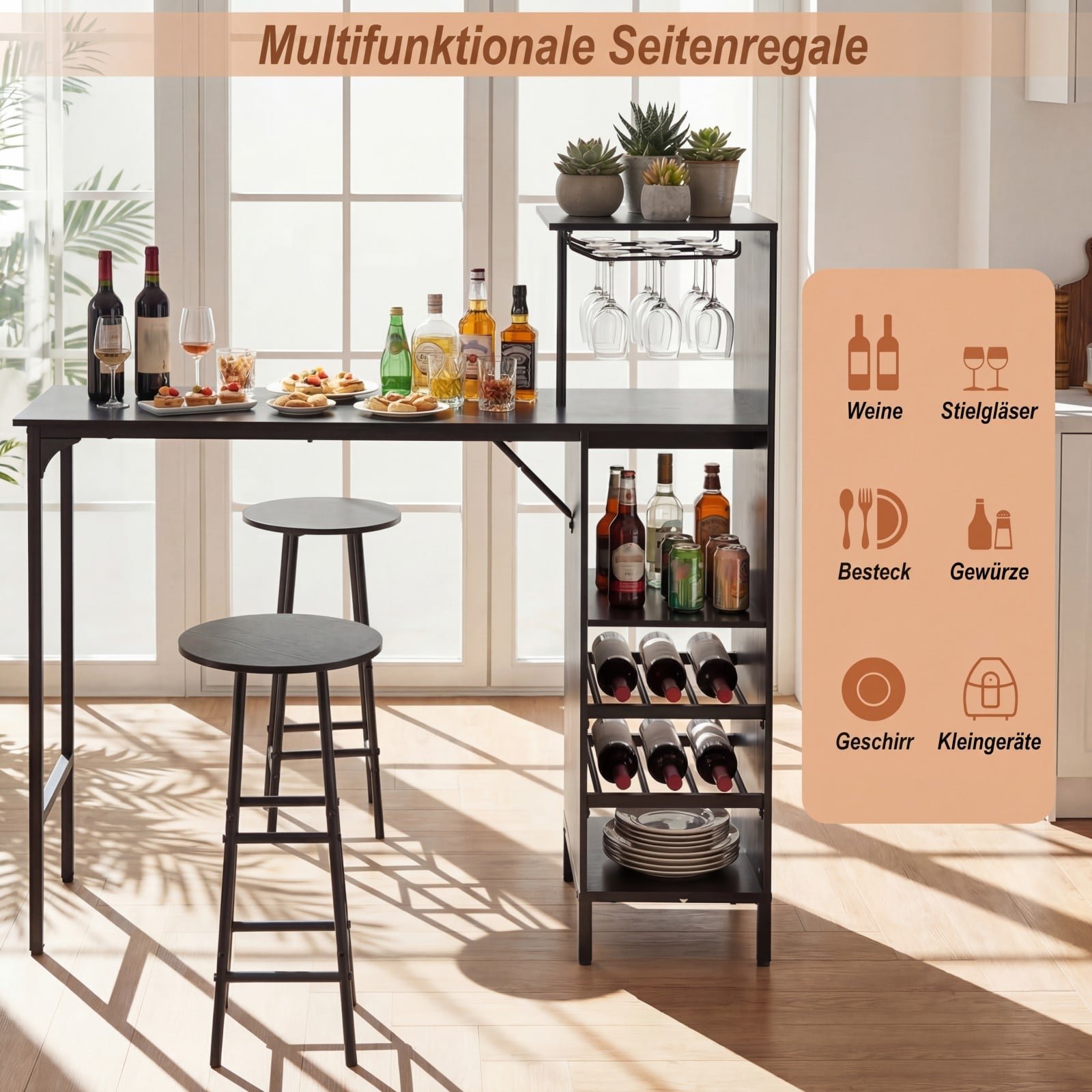 Baro stalo komplektas su vyno laikikliais ir šoninėmis lentynomis (Juoda)