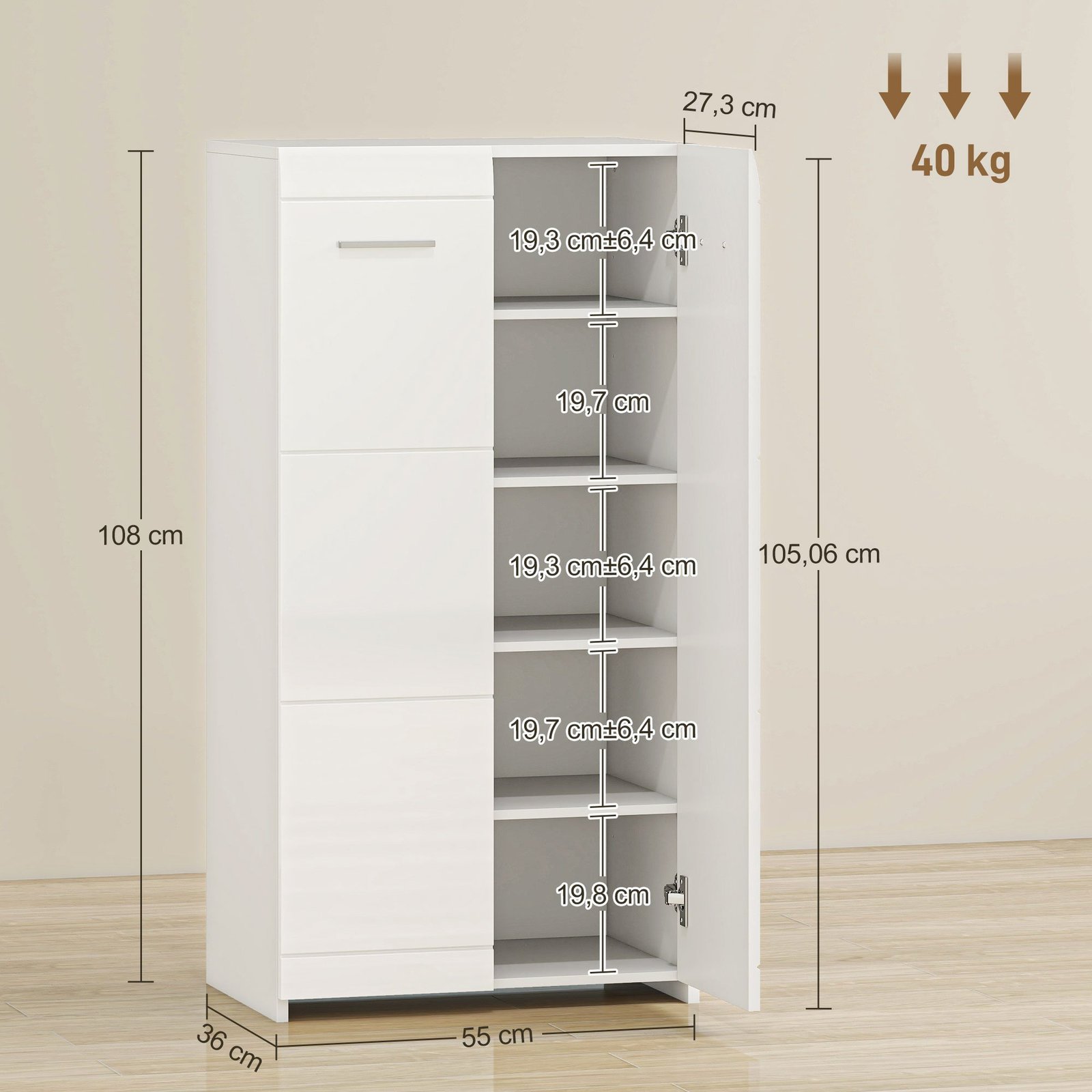 Išlaikykite savo batų kolekciją tvarkingą ir stilingą su batų spintele! Joje galėsite laikyti iki 10 porų batų (iki 45 EU dydžio) ir apsaugoti juos nuo dulkių už elegantiškų durelių. Pritaikykite tris lentynas individualiai, kad puikiai sutalpintumėte plokščius batus, sportbačius ar batus aukštesniais aulais. Jos minimalistinis dizainas ir lygus paviršius suteiks modernaus žavesio koridoriams, miegamiesiems ar svetainėms, todėl batų laikymas bus praktiškas ir stilingas.