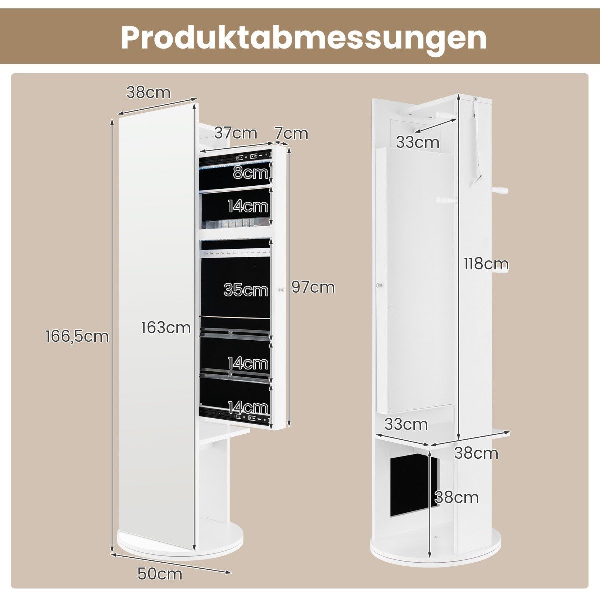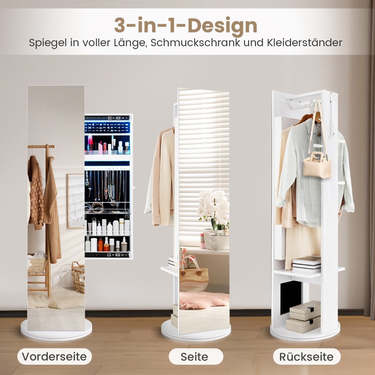 - 3-in-1 dizainas: sujungia didelį veidrodį, papuošalų spintelę ir drabužių kabyklą.