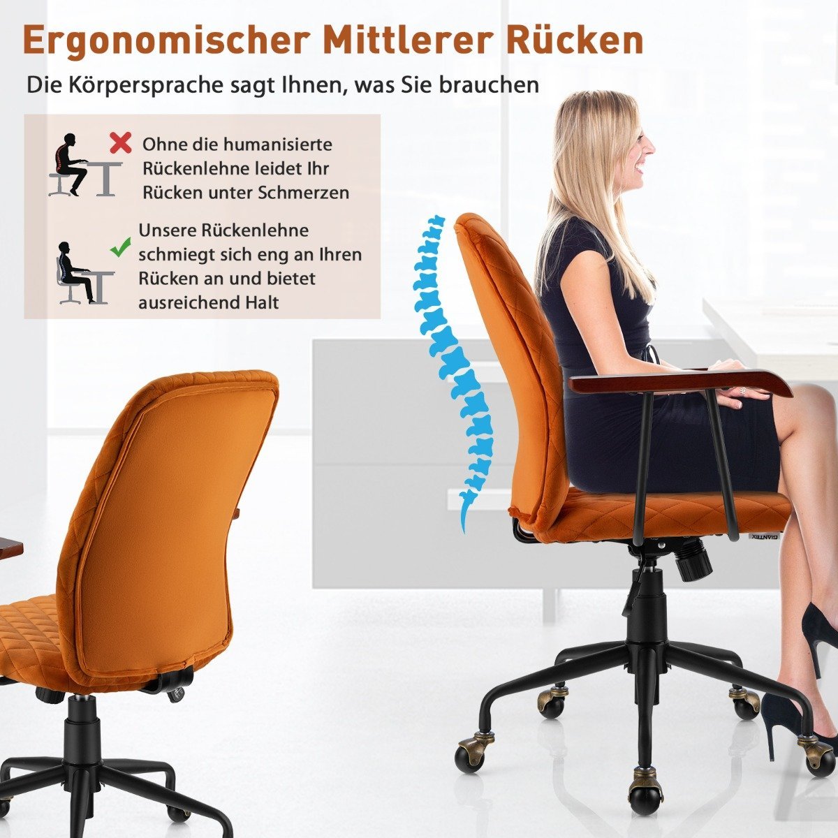 Biuro kėdė su vidutinio aukščio atlošu ir mediniais porankiais (Oranžinė)