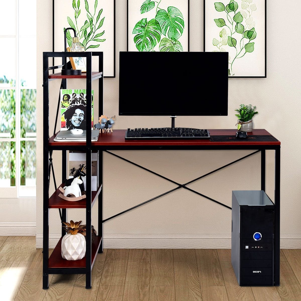 Biuro stalas su keturiomis lentynomis ir metaliniu rėmu (Raudonai rudas)
