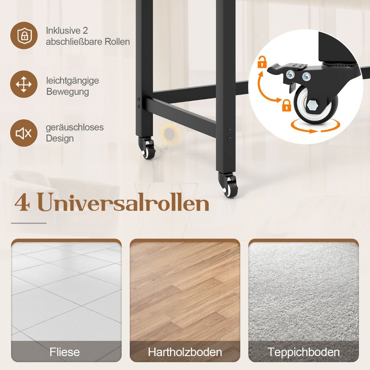 - 4 universalūs ratukai, iš kurių 2 su stabdžiais, užtikrina lengvą mobilumą ir stabilumą.