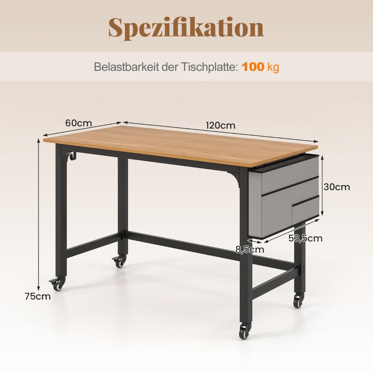 Darbinis stalas su ratukais ir nuimama sekcija (Juoda)