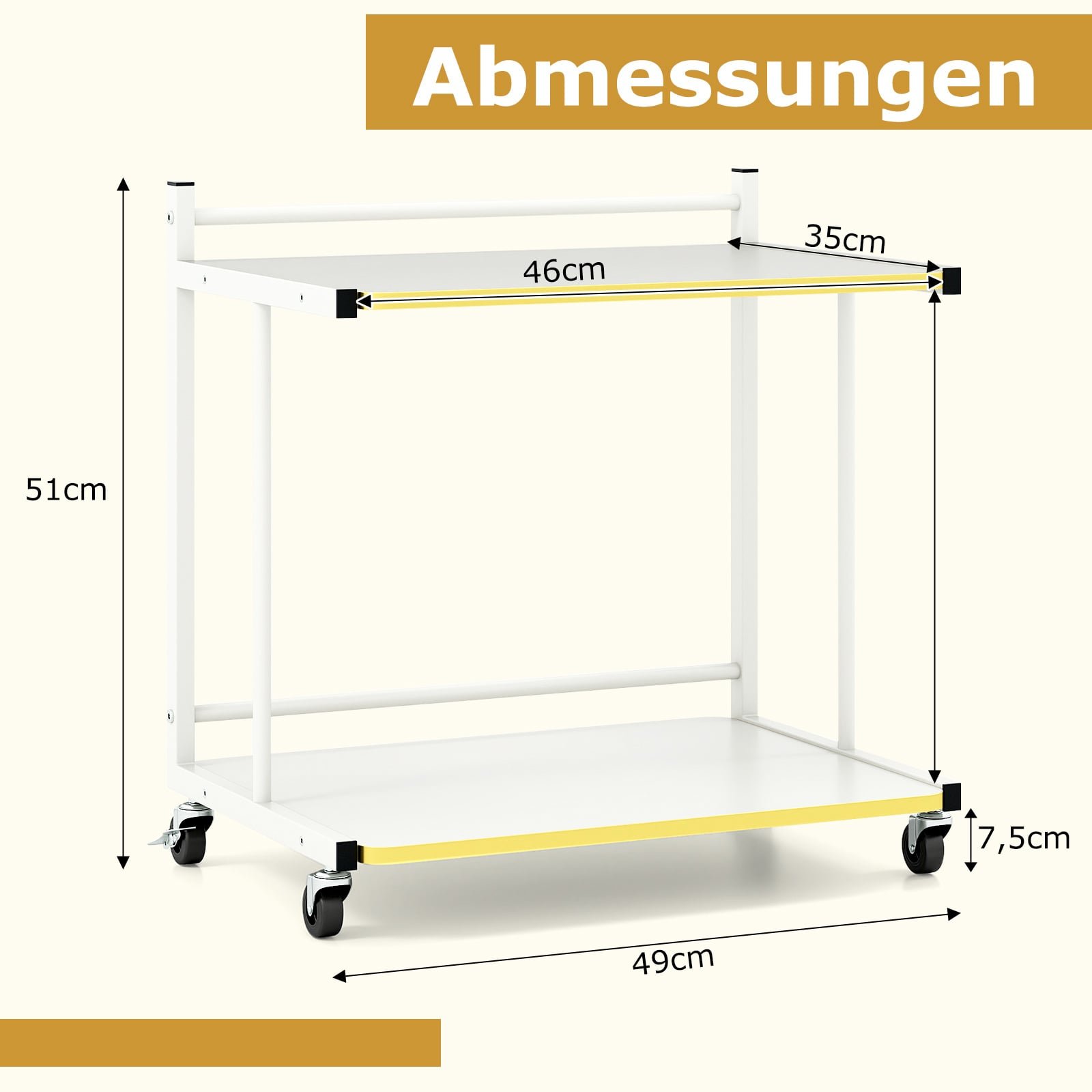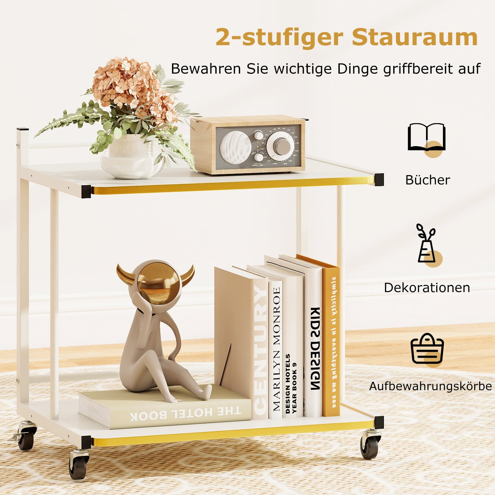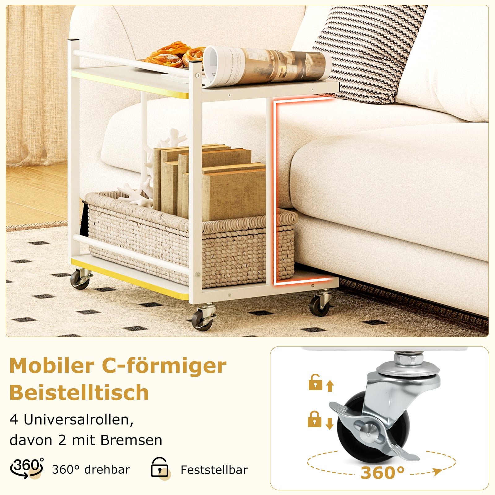 Pagerinkite savo kasdienybę su šiuo praktišku ir stilingu mobiliu staliuku! Dvi erdvios lentynos suteikia patogią vietą kavos puodeliui, užkandžiams ar mėgstamai knygai, kad viskas būtų po ranka. Su 4 sklandžiai riedančiais ratukais, iš kurių du turi fiksatorius, staliukas lengvai perkeliamas ir patikimai užfiksuojamas. Elegantiškas C formos dizainas ne tik taupo vietą, bet ir puikiai dera prie įvairaus interjero.