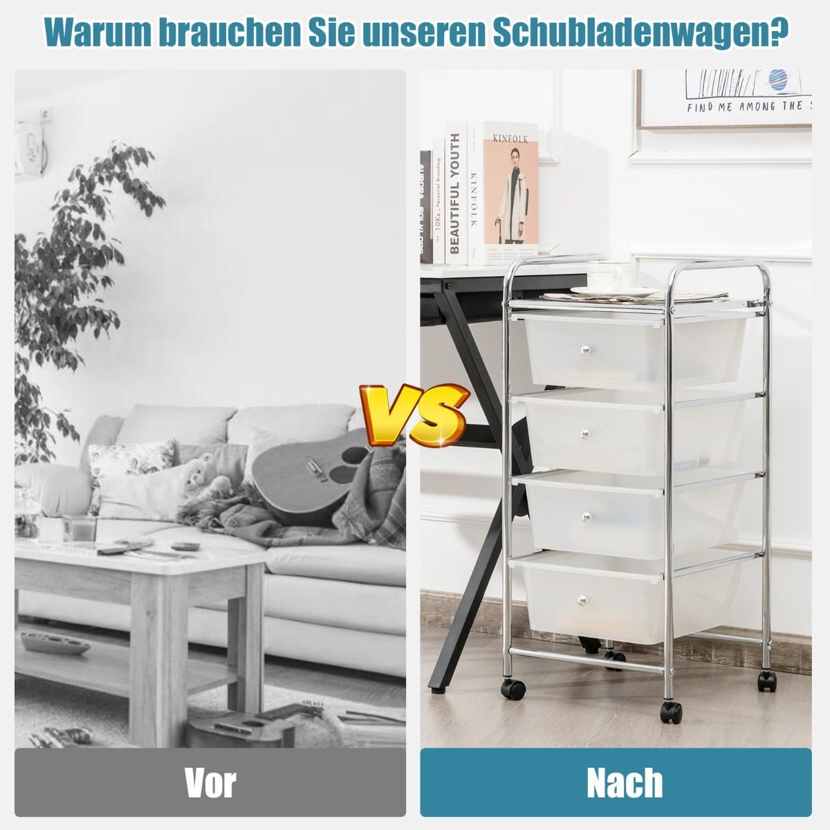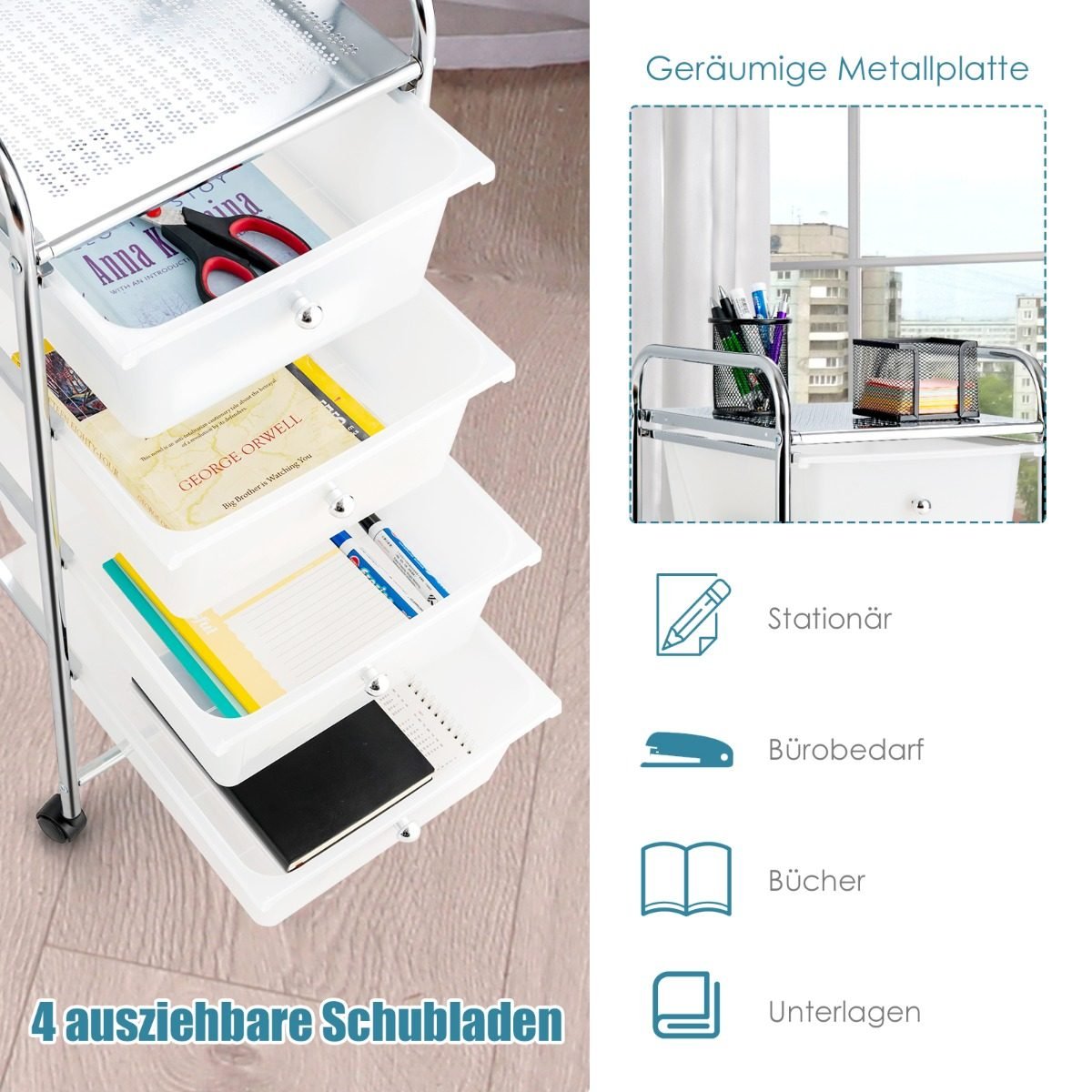 Sutvarkykite savo erdvę su šiuo universaliu daiktų laikymo vežimėliu! Jo vertikalus 4 stalčių dizainas taupo vietą ir leidžia patogiai bei tvarkingai susidėti įvairius daiktus.