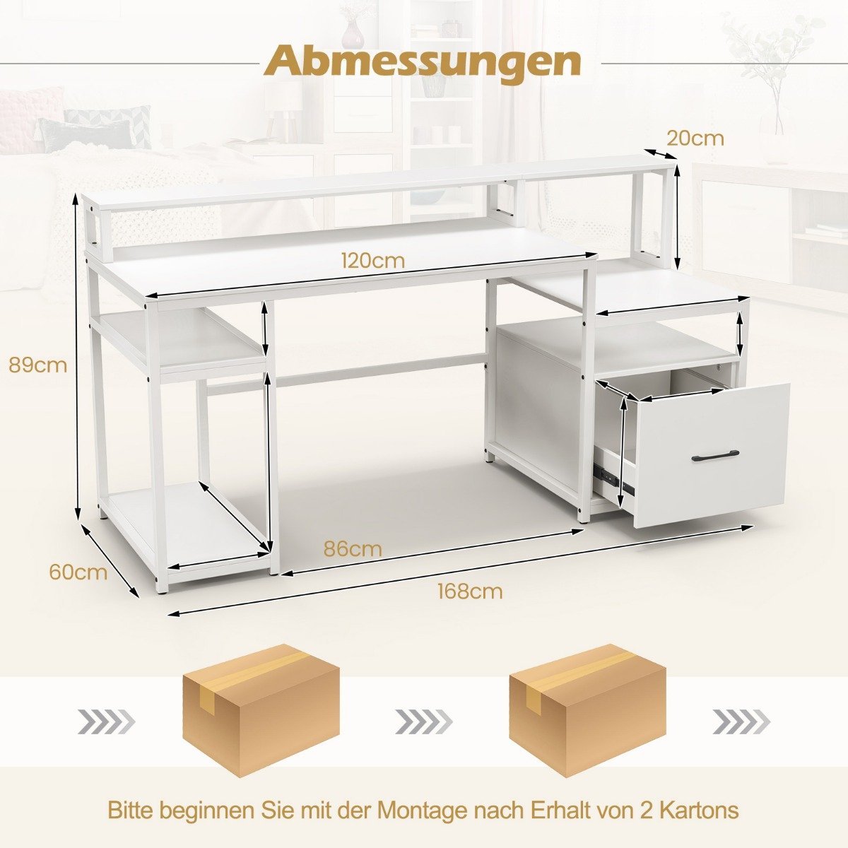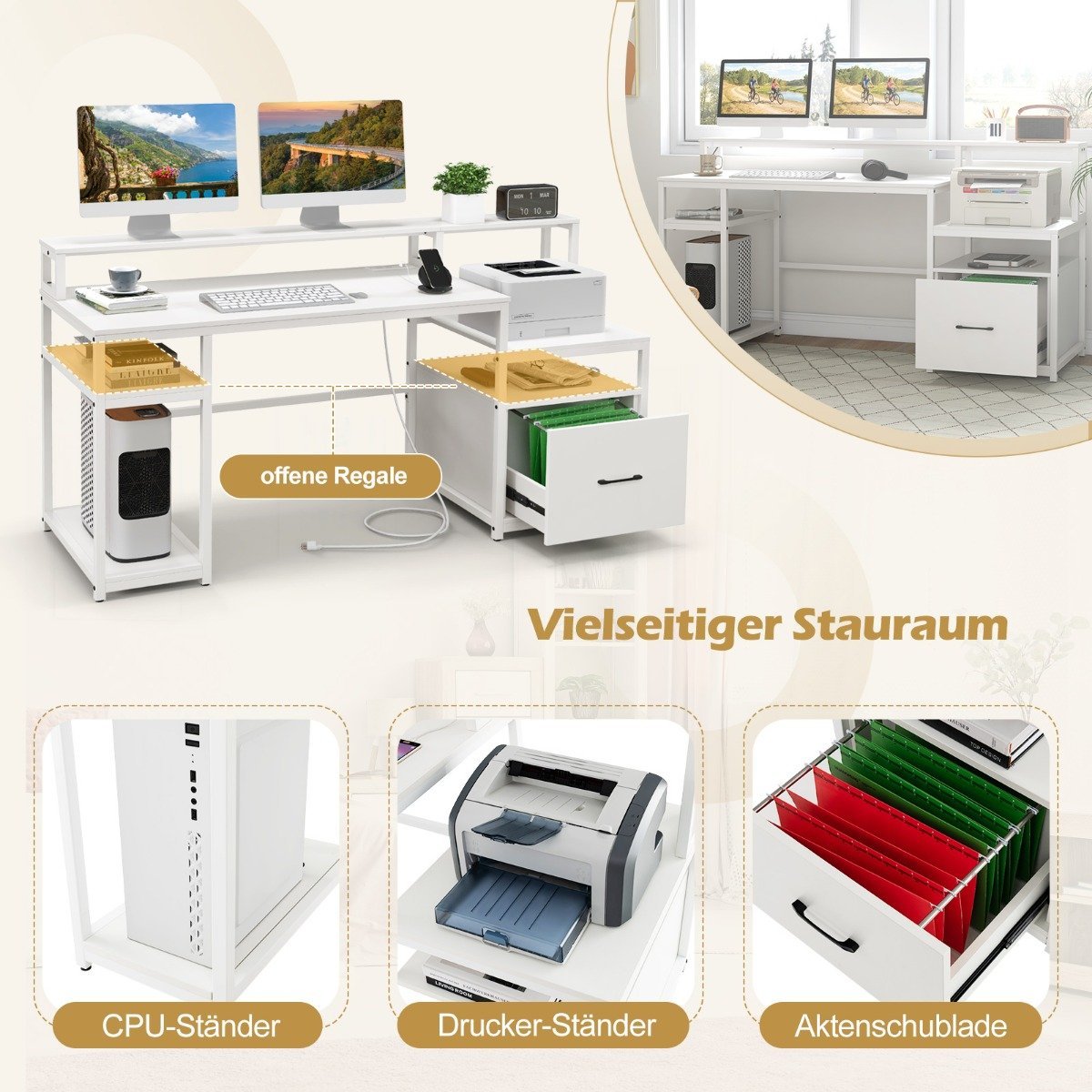 Darbo stalas su monitoriaus ir spausdintuvo laikikliu bei dokumentų spinta 168 cm (Balta)