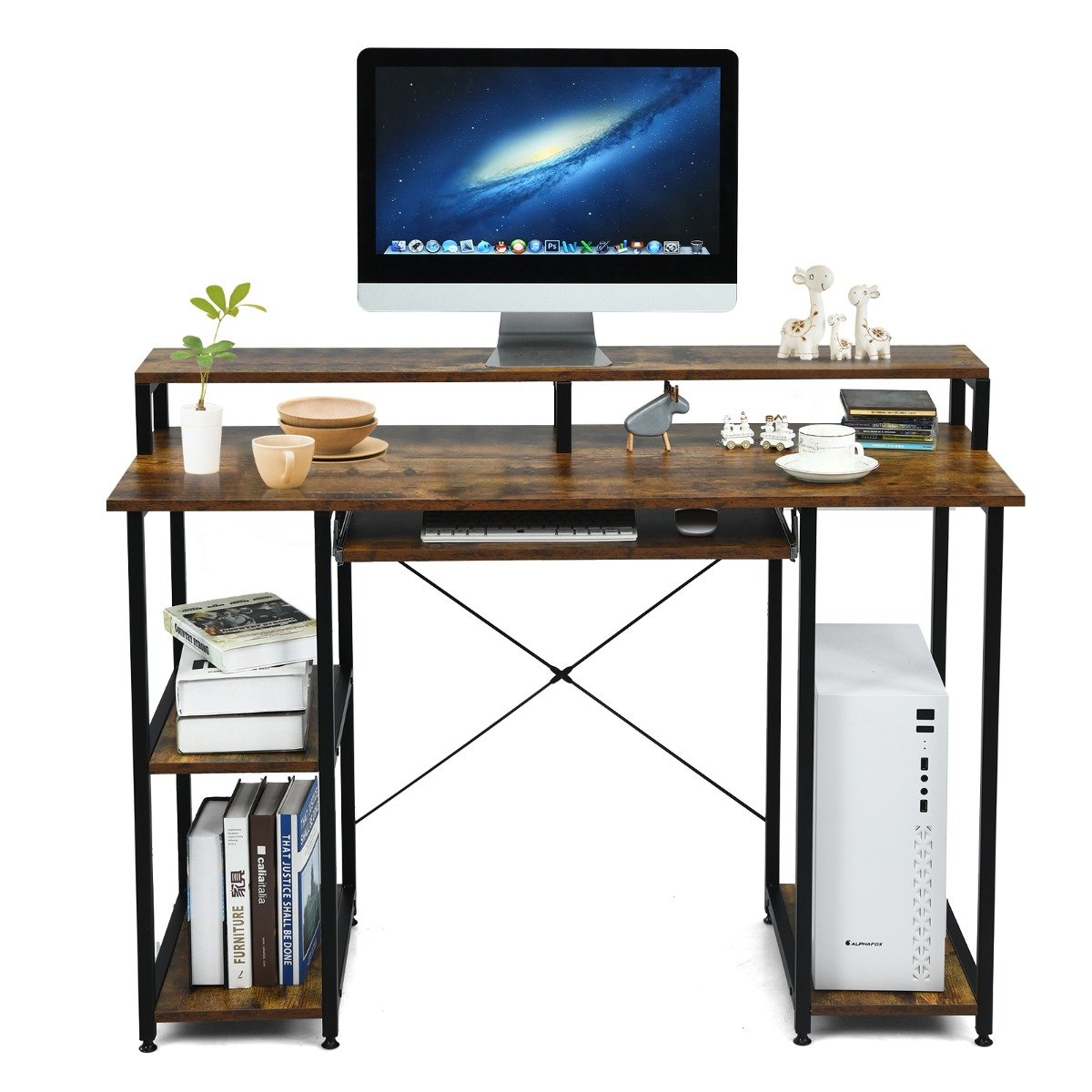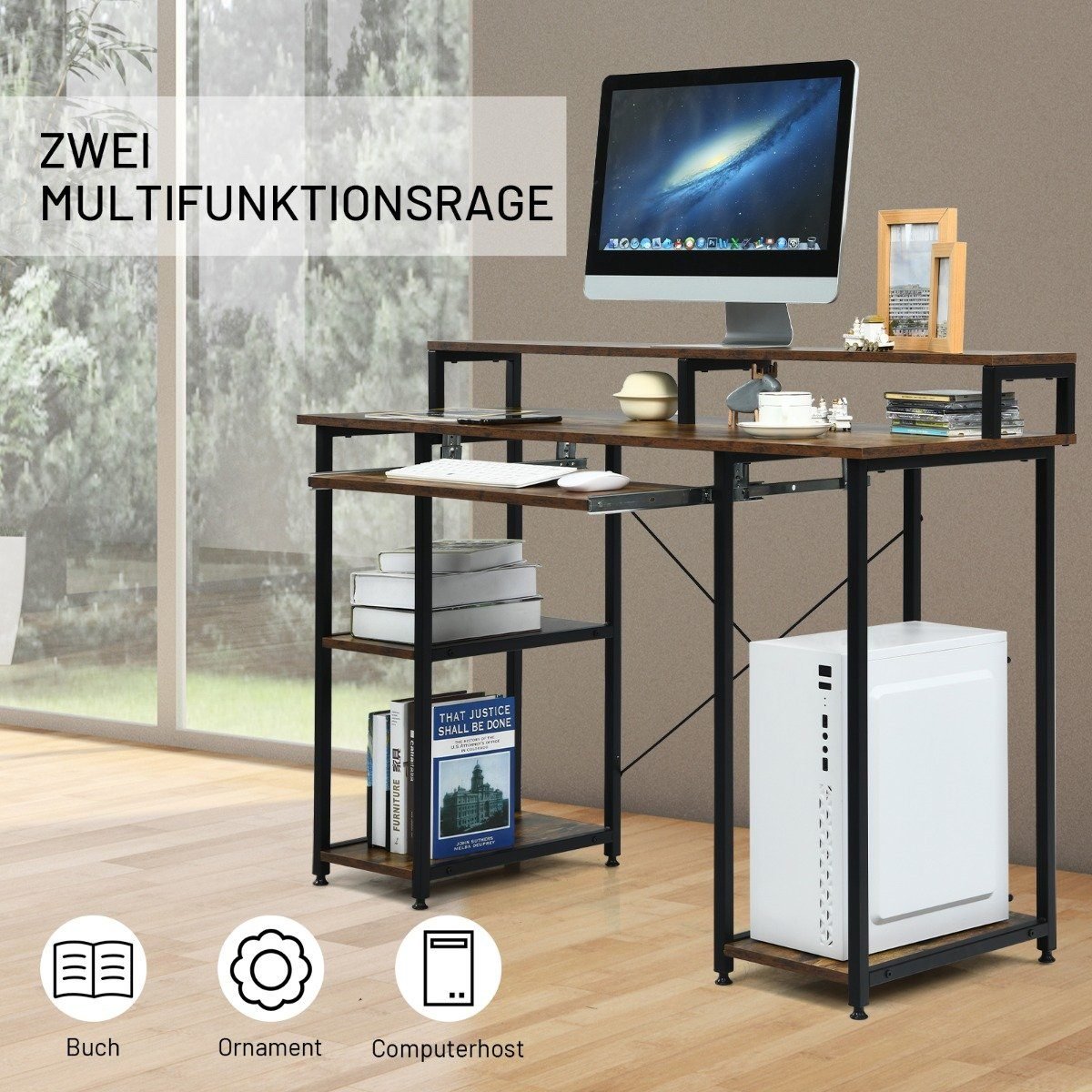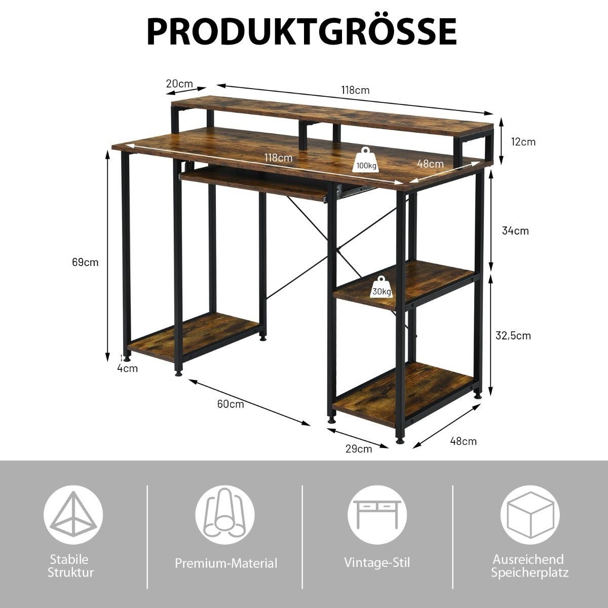 - Daug vietos daiktams laikyti: du atviri skyriai, specialiai sukurtas kompiuteriui, monitoriaus paaukštinimas ir ištraukiama klaviatūros lentynėlė.