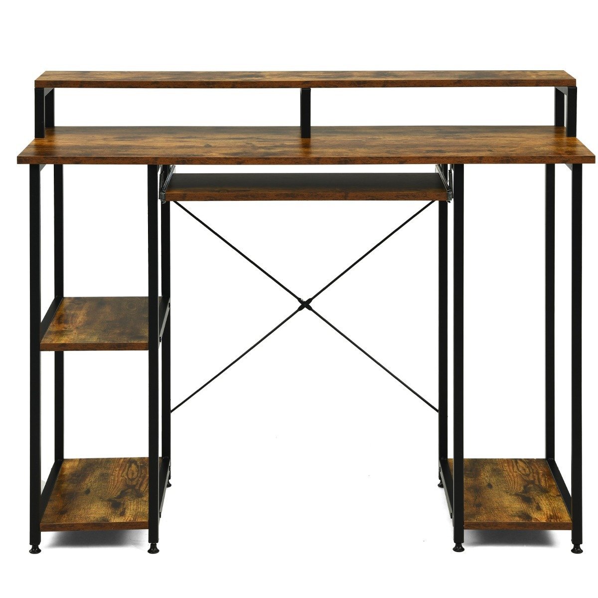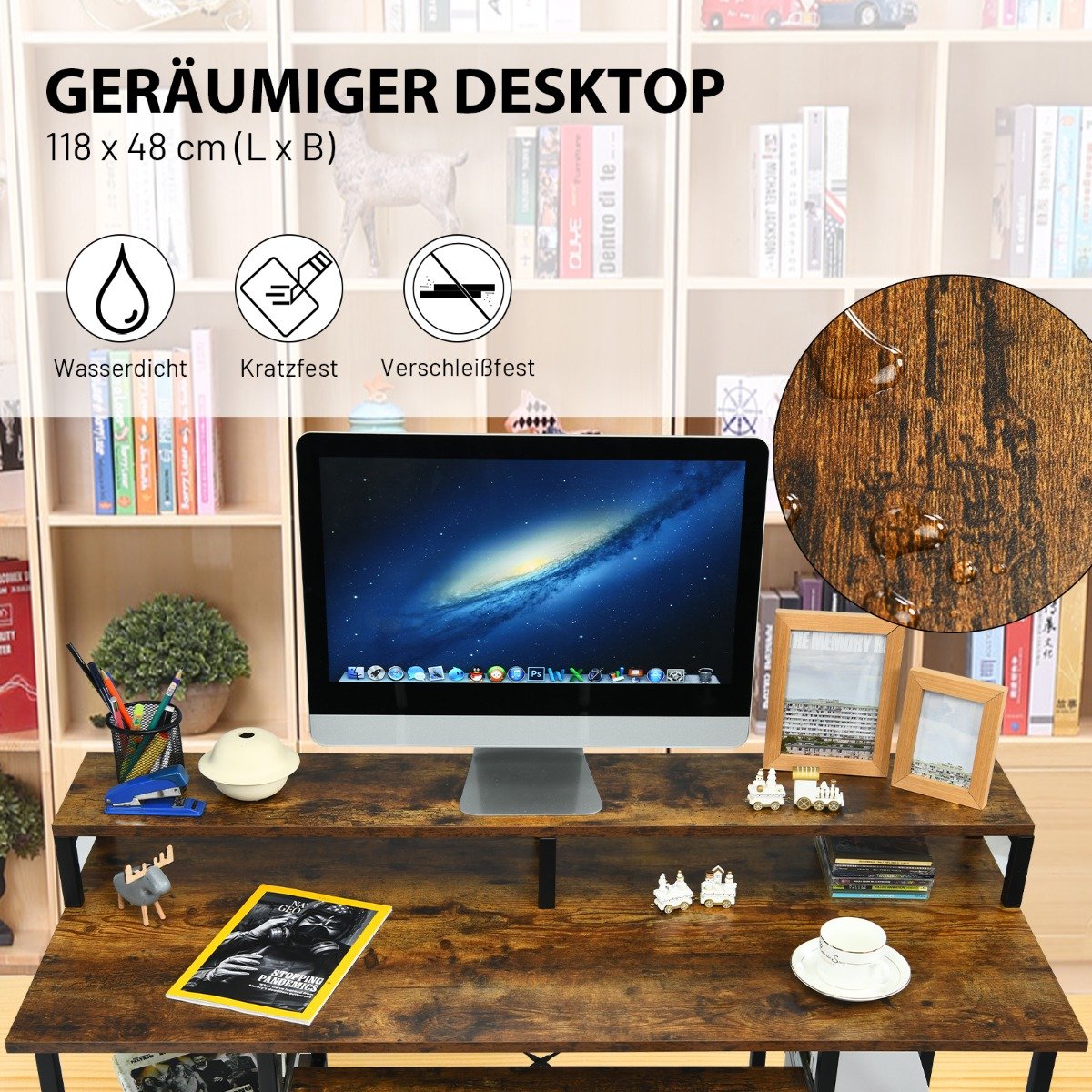 Darbo stalas su monitoriaus stoveliu ir lentynomis (Ruda)