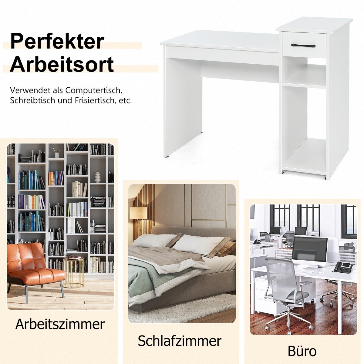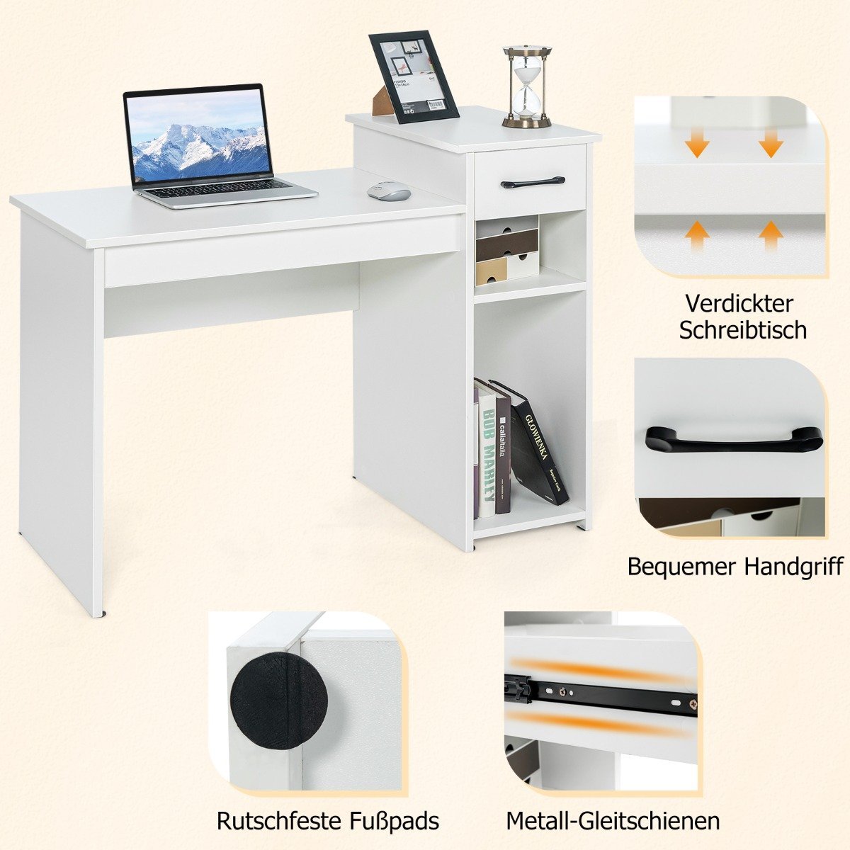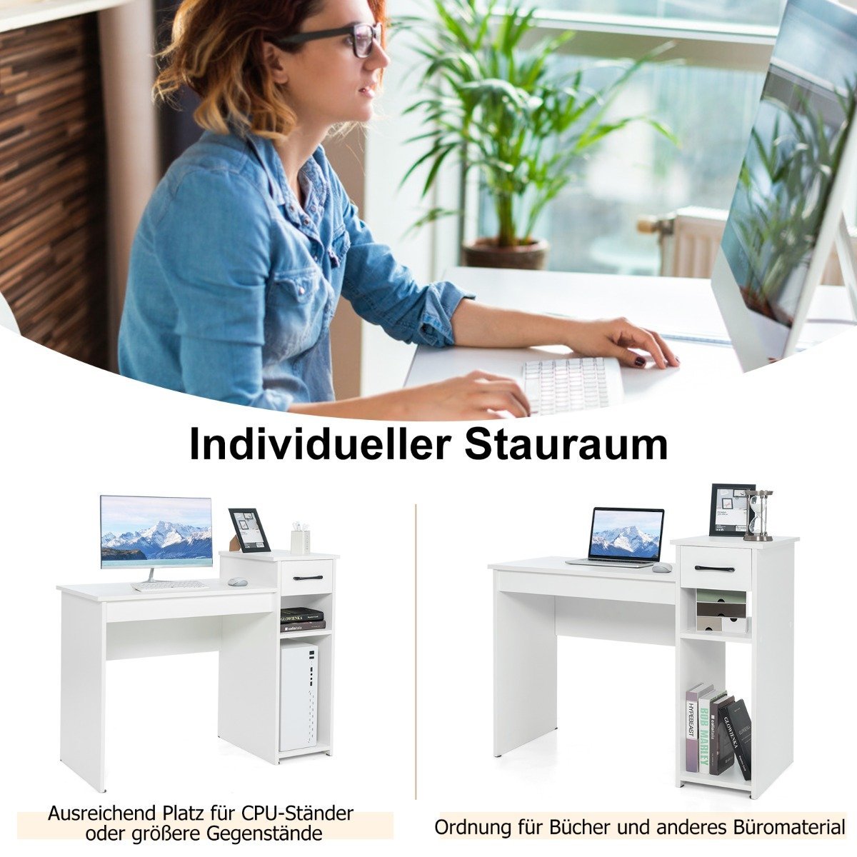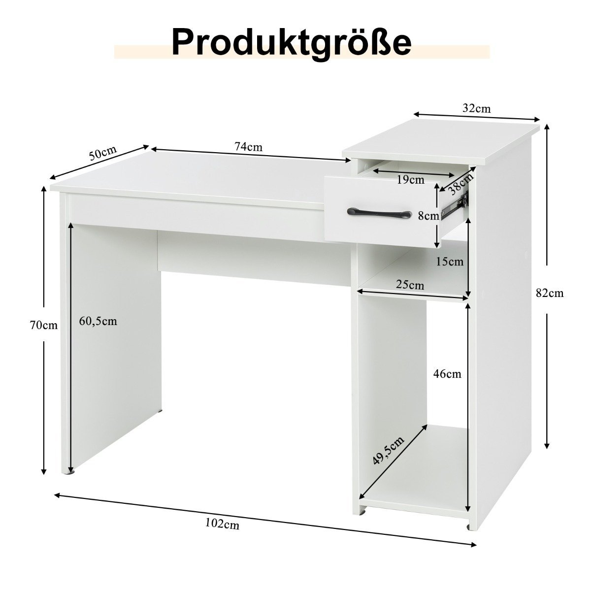 Darbo stalas su stalčiumi ir atviromis lentynomis (Balta)