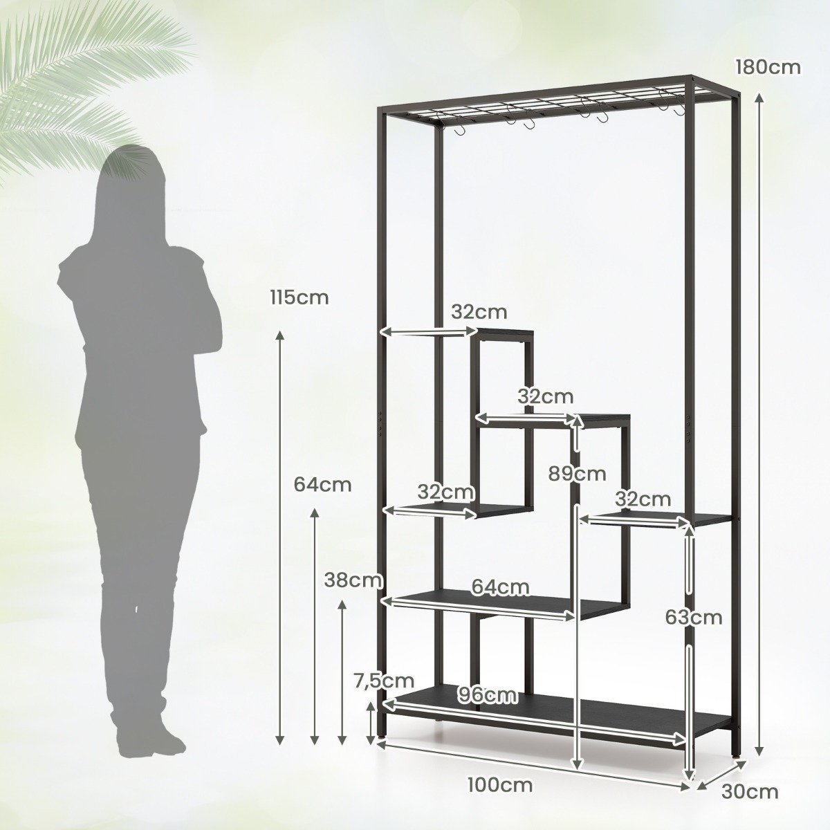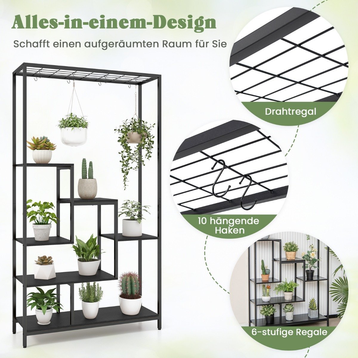 Daugiaaukštis augalų stovas 180 cm su 10 kabliukų (Juoda)