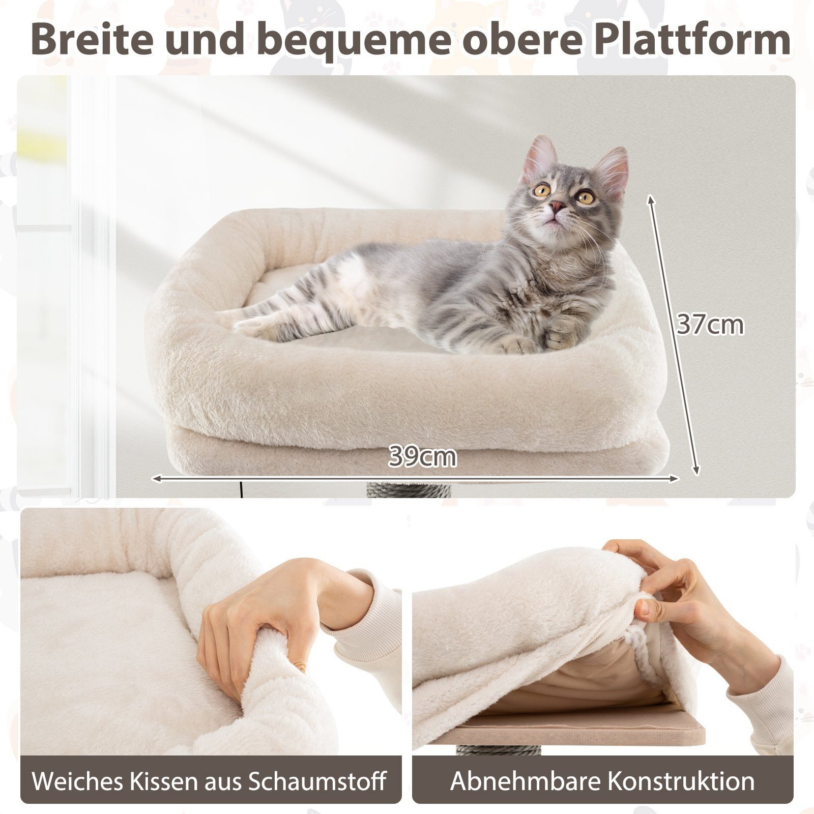 Suteikite savo katei tobulą komforto ir praktiškumo derinį su šiuo nameliu! Erdvus ir didelis namelis jaukiam poilsiui bei slėpimui, o plati viršutinė platforma su storu putplasčio paminkštinimu – prabangi vieta ilsėtis ir stebėti aplinką. Nuimamos pagalvėlės idealiai tinka naudoti ištisus metus, o lygi lenta lengvai valoma.