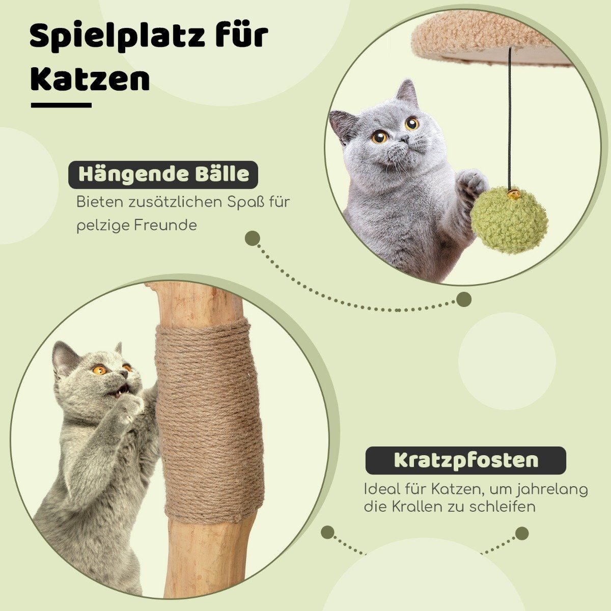 - Tvirti draskymui skirti stulpai, apvynioti džiuto virve, tenkina natūralius katės instinktus.