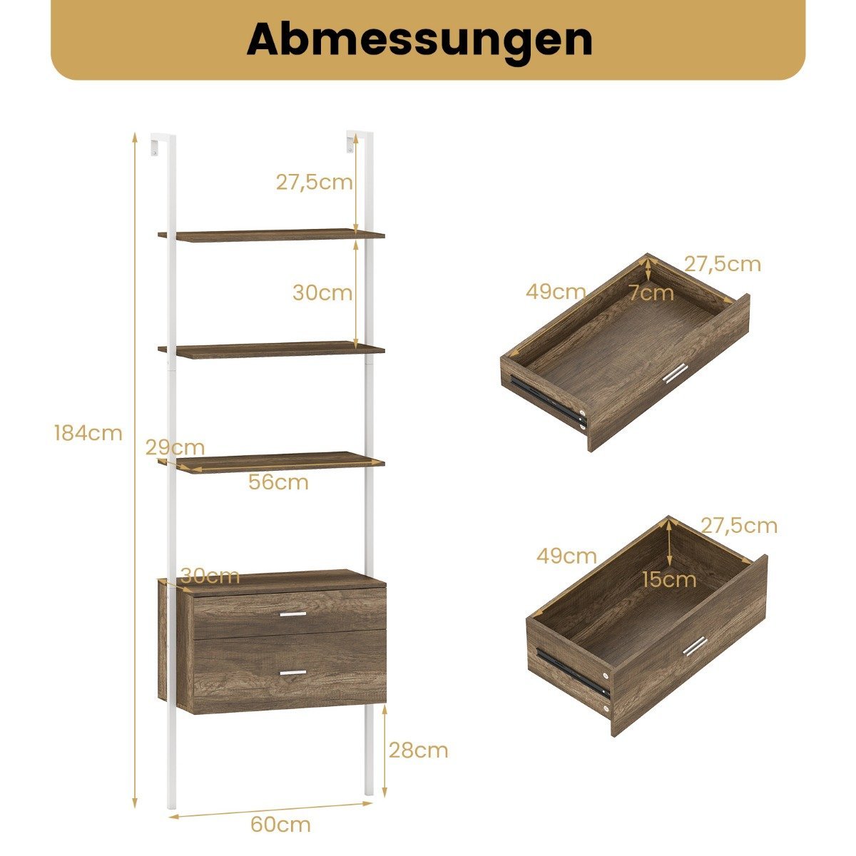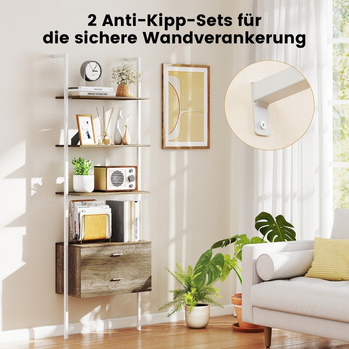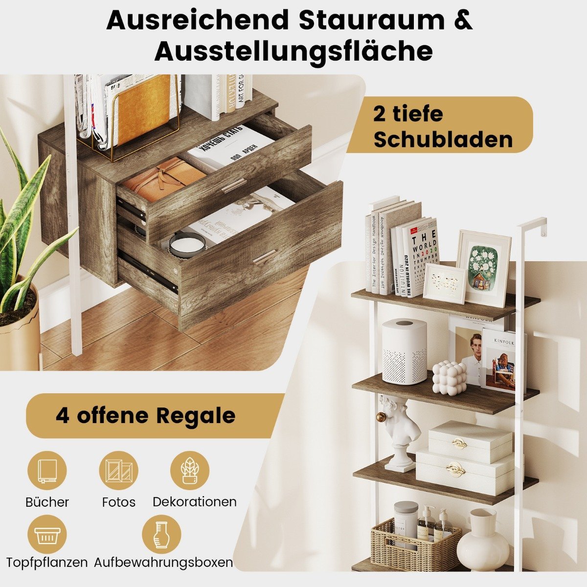 Padidinkite savo gyvenamosios erdvės funkcionalumą su šiuo stilingu kopėčių tipo lentynų agregatu! Šis praktiškas daiktų laikymo sprendimas, papildytas stalčiais, puikiai derina atvirų lentynų demonstravimo galimybes su diskretiška, paslėpta sandėliavimo erdve. Sukurtas su tvirtu metaliniu rėmu ir dviguba apsauga nuo apsiverimo, jis užtikrina stabilumą ir saugumą jūsų namuose.