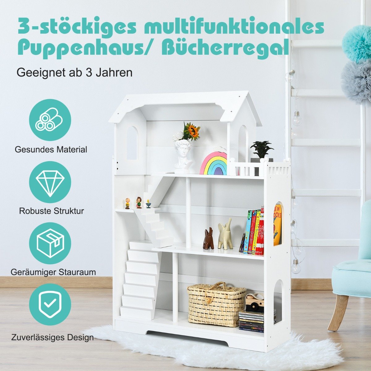 - Daugiafunkcis 2-in-1 dizainas: gali būti naudojamas kaip knygų lentyna ir kaip lėlių namelis žaidimams.