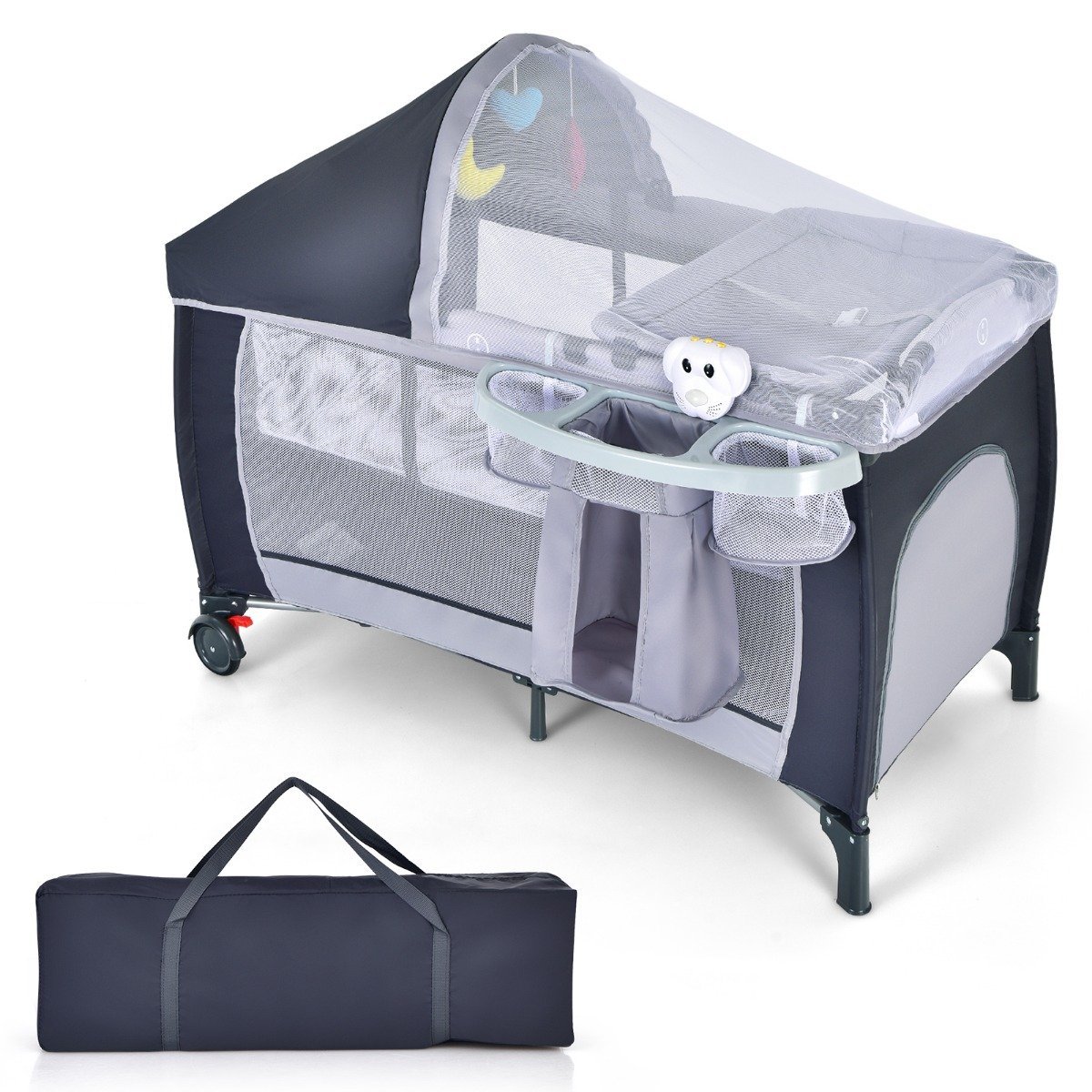 - Kompaktiškas ir patogus transportuoti: sulankstomas dizainas ir komplekte esantis nešiojimo krepšys leidžia lengvai pasiimti lovytę visur su savimi.