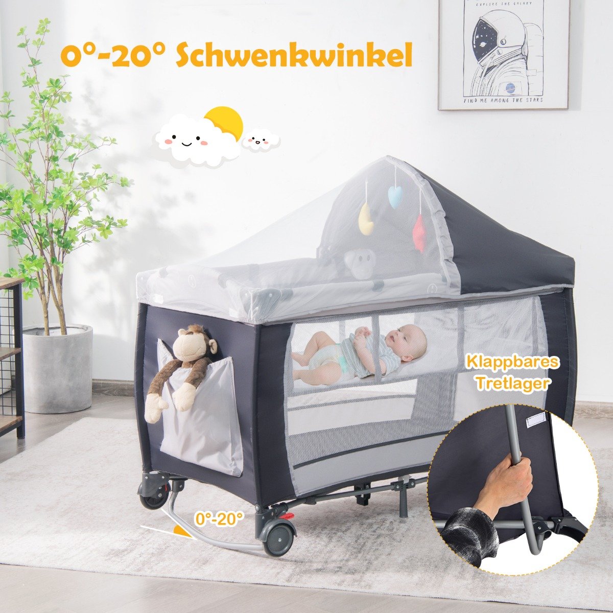- Universali 4-in-1 funkcija: tai ir kūdikio lovytė, ir vystymo stalas, ir lopšelis, ir žaidimų centras.