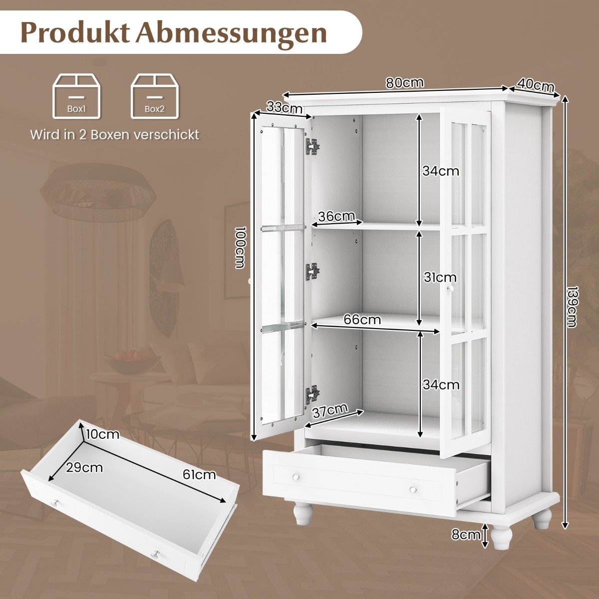 - Skaidrios grūdinto stiklo durys leidžia gražiai eksponuoti dekoracijas ir vertingus daiktus.