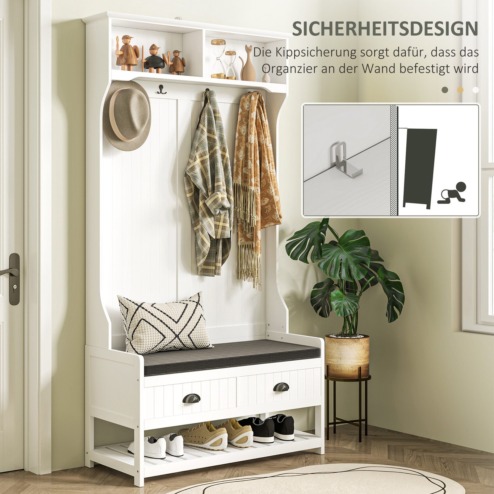 ✔ Išmanus „du viename“ dizainas: patogus suoliukas ir daugiafunkcinė laikymo lentyna su drabužių kabykla viename