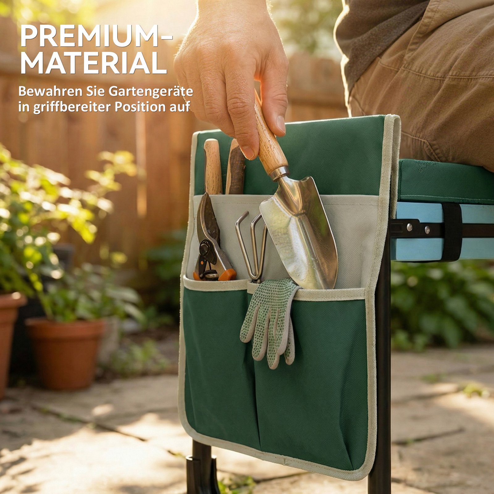 ✔ 2-in-1 suoliukas keliams sodo darbams, lengvai transformuojamas iš minkštos kelių apsaugos į pakeltą sėdynę.