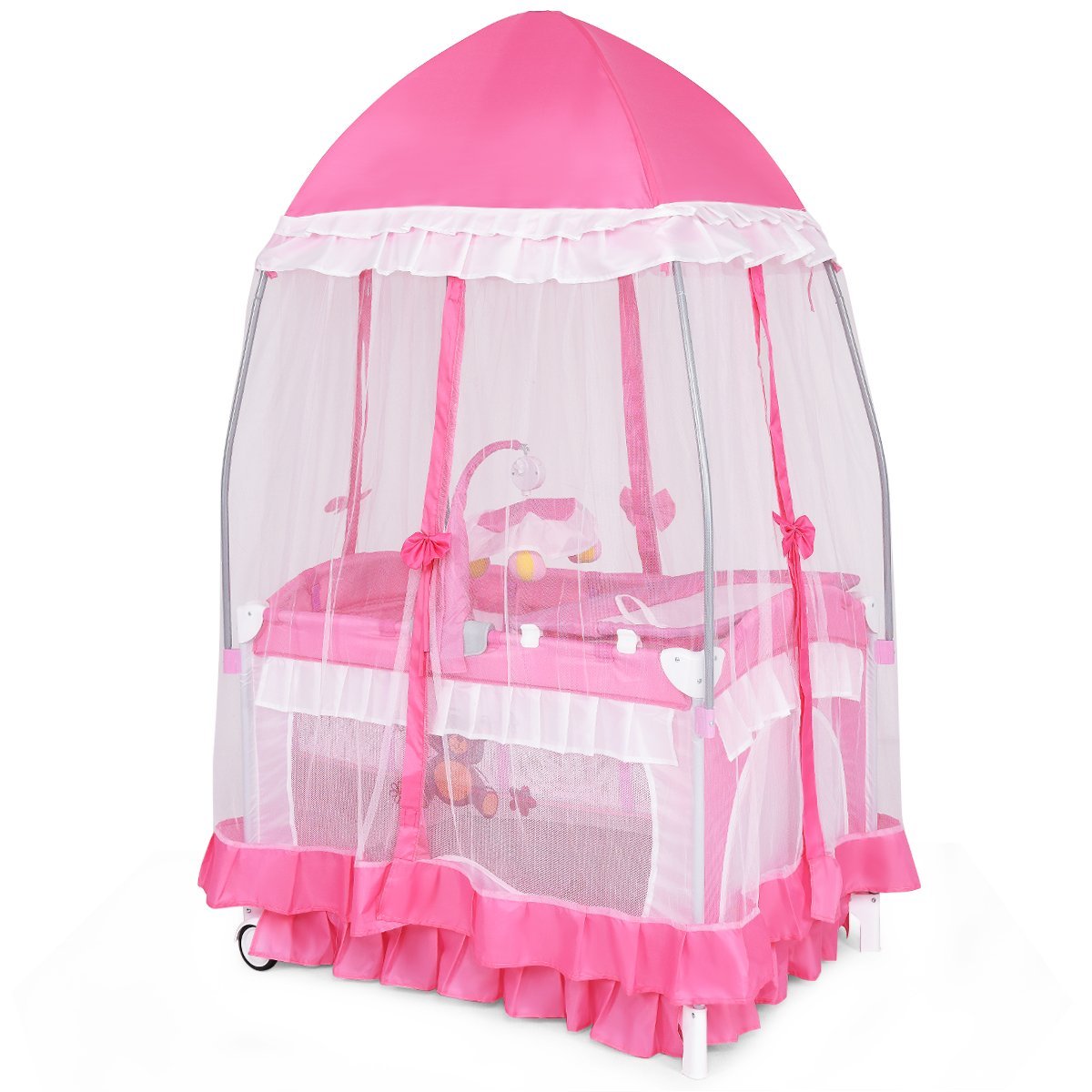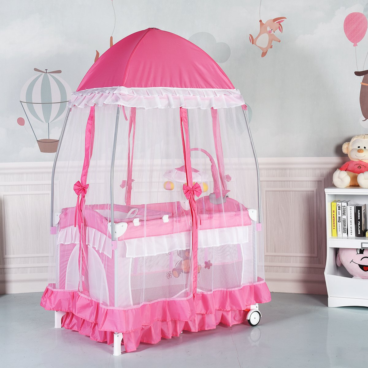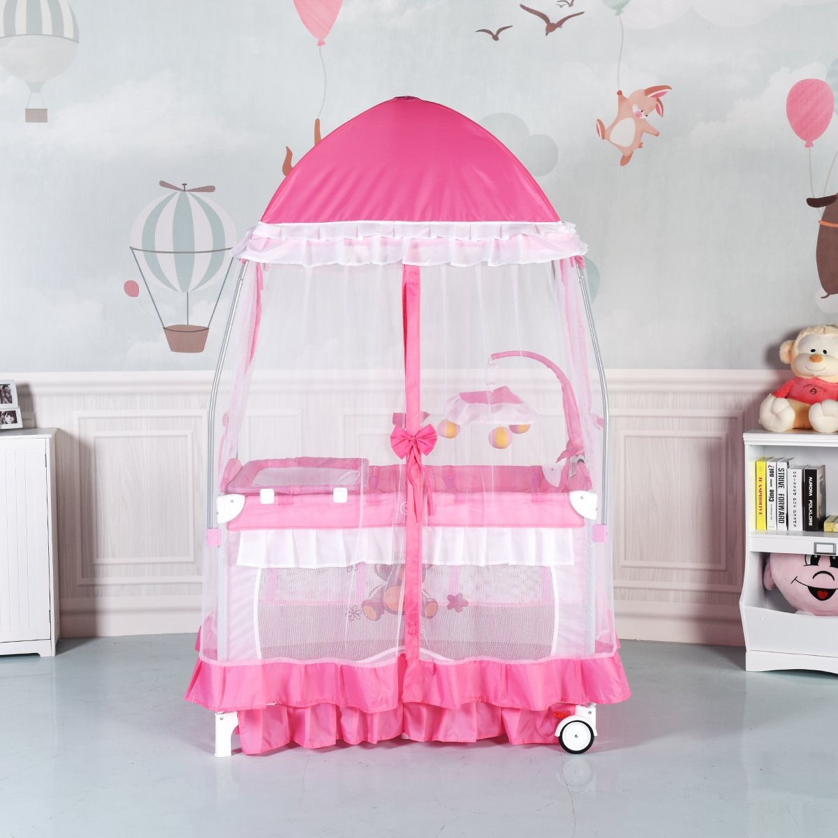 Daugiafunkcinė sulankstoma dviejų lygių kelioninė lovelė su vystymo stalu (Rožinė)