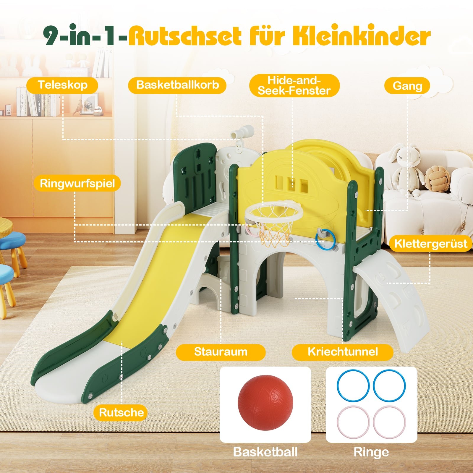 Padovanokite savo vaikui nepamirštamus nuotykius su mūsų daugiafunkciniu 9 viename čiuožyklos ir žaidimų kompleksu! Šis vidaus žaidimų kompleksas su teleskopu, krepšinio lanku, čiuožykla, žiedų mėtymo žaidimu, šliaužiojimo tuneliu ir laipiojimo konstrukcija skatina aktyvų judėjimą ir lavina kūrybiškumą. Rinkinys sukurtas atsižvelgiant į maksimalų saugumą: tvirti turėklai ir neslystantys laipteliai padeda mažyliams drąsiai tyrinėti, o visos dalys pagamintos iš saugių, be BPA medžiagų.