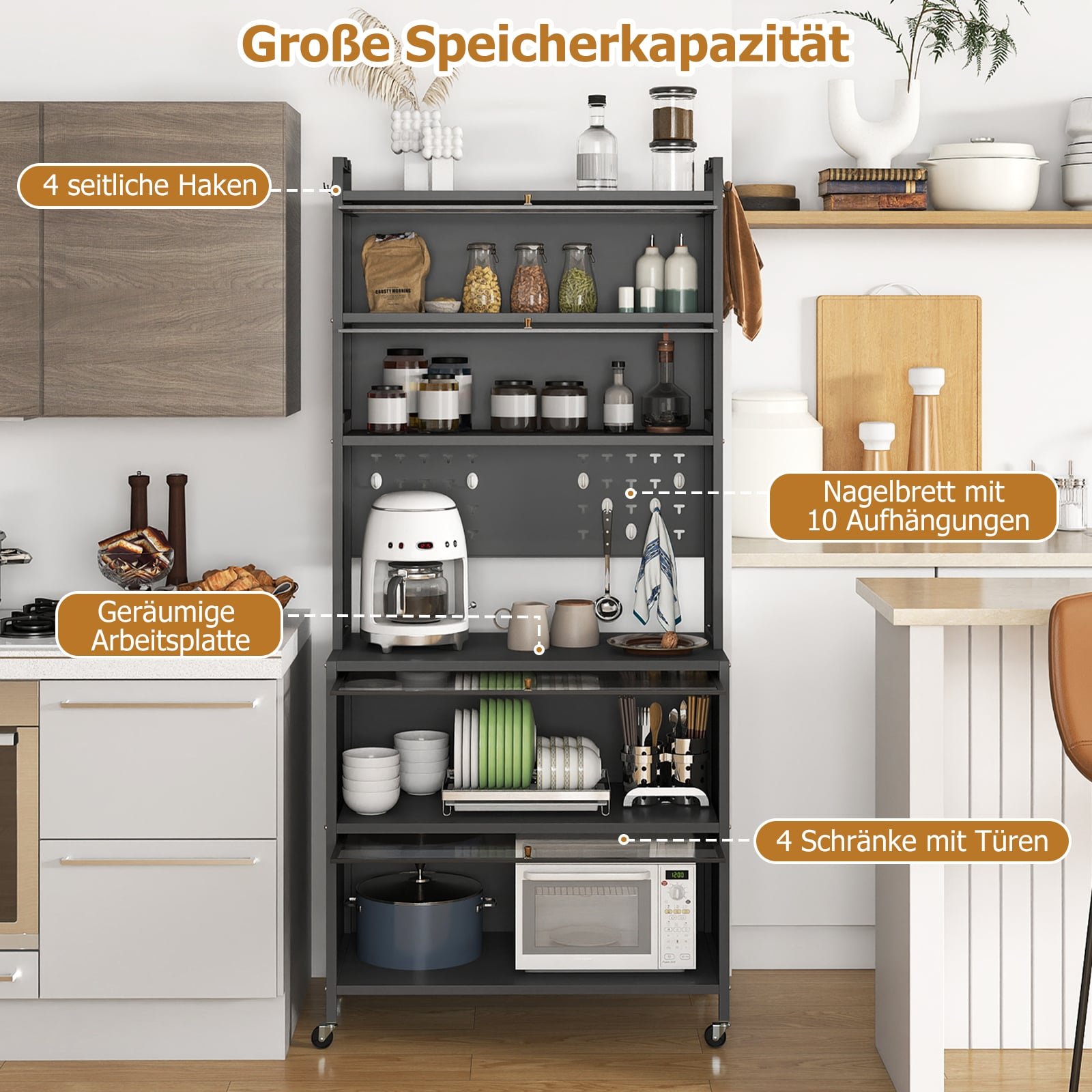 Daugiafunkcinė virtuvės spintelė su 6 lentynomis darbastaliu ir skaidriomis durelėmis (Pilka)