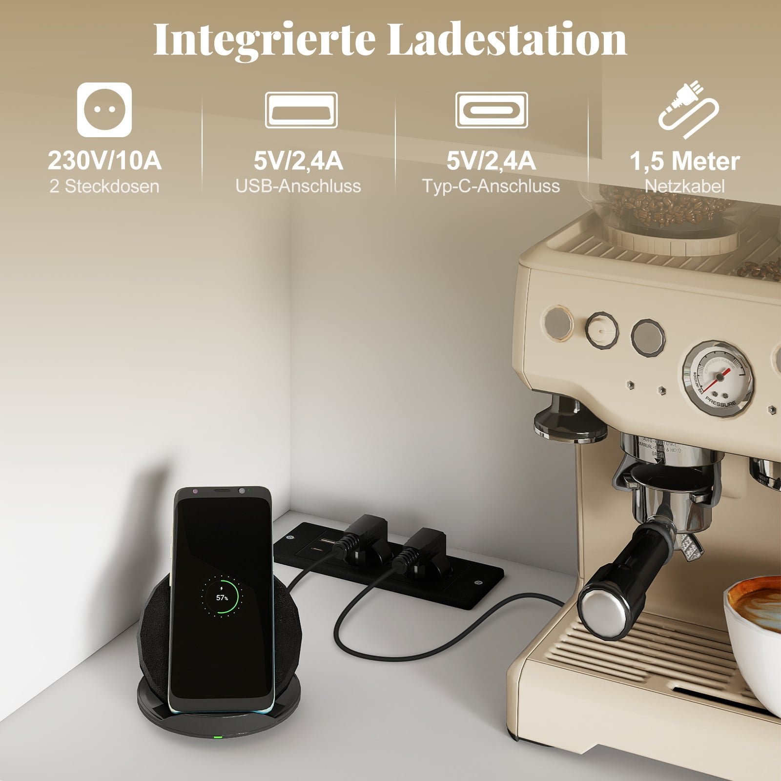 Ši universali virtuvinė spintelė su baru siūlo idealų daiktų laikymo sprendimą, padedantį palaikyti tvarką ir užtikrinti įrenginių įkrovimą. Joje rasite viendurę spintelę, ištraukiamus stalčius, atvirą skyrių ir dvidurę spintelę. Integruota įkrovimo stotelė su AC lizdais, USB ir Type-C jungtimis patikimai maitins jūsų prietaisus, o reguliuojama lentyna prisitaikys prie įvairaus aukščio daiktų.